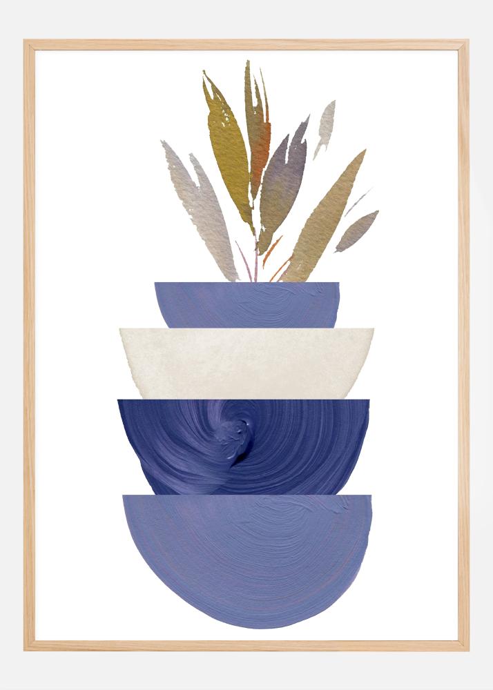 Iš viršutinio dubens centro kyla abstrakčios formos, primenančios žalumynus ar plunksnas, pieštos natūraliomis spalvomis, tokiomis kaip alyvuogių žalia, rūdžių spalva, pilka ir smėlio spalva. Organinės formos kartu su geometriniais dubenimis sukuria unikalų kontrastą, kuris yra tiek akims malonus, tiek apmąstymus sukeliantis. Šis atspaudas sujungia gamtos ir dizaino elementus taip, kad užfiksuotų modernios bohemiškos stiliaus esmę, su spalvų palete, kuri apima žemiškus tonus ir šaltus mėlynus atspalvius. Plakatas siūlo elegantišką ir stilingą detalę bet kuriam kambariui - nesvarbu, ar tai svetainė, miegamasis ar biuras.
