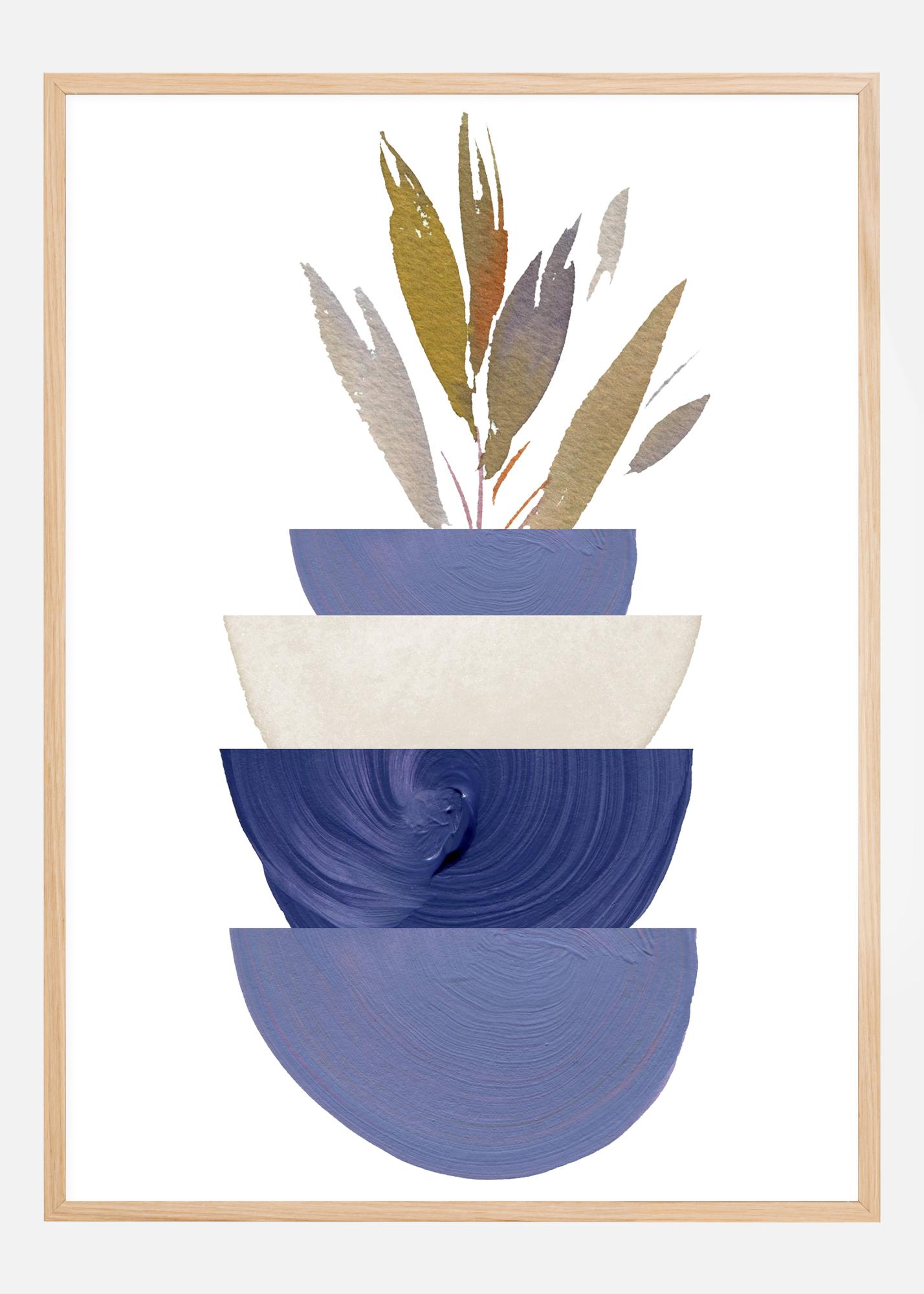Šis modernus ir meninis plakatas vaizduoja bohemišką dubenį minimalistiniame dizaine, puikiai tinka tiems, kurie nori pridėti ramybės ir madingo dizaino jausmą savo namuose. Motyvas, kuris sutelktas į harmoningą formos ir spalvų sąveiką, išryškina didelį dubenį mėlynų atspalvių su ryškia ir banguota tekstūra, kuri užpildo apatinę vaizdo dalį. Virš dubenio yra platforma neutralios smėlio spalvos tonas, ant kurios stovi kitas, mažesnis dubuo tamsesnio mėlyno atspalvio.