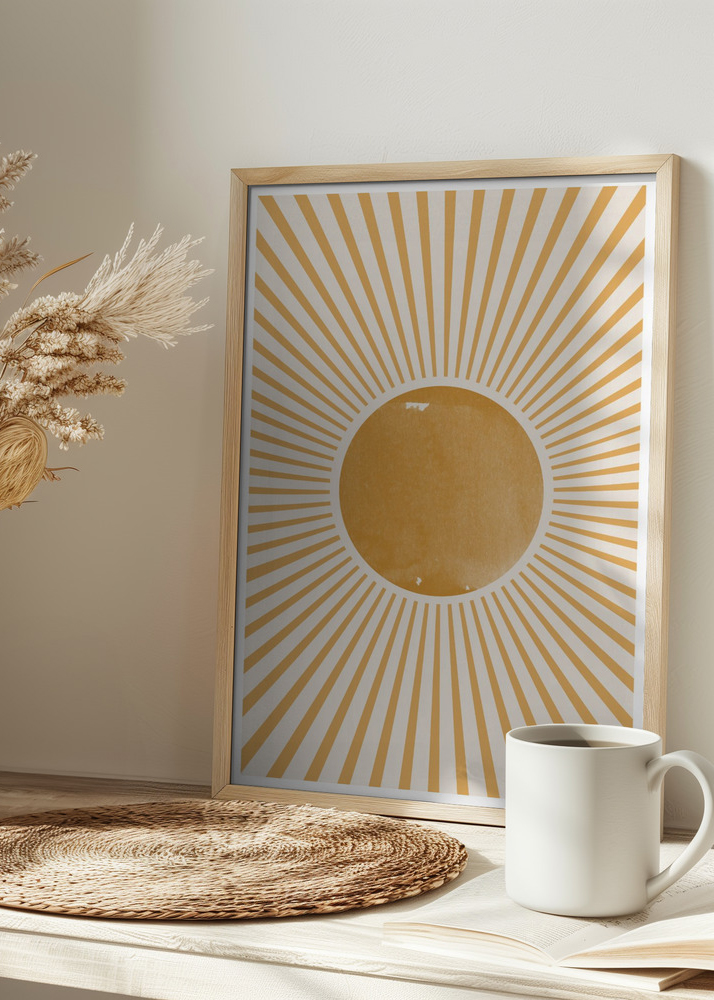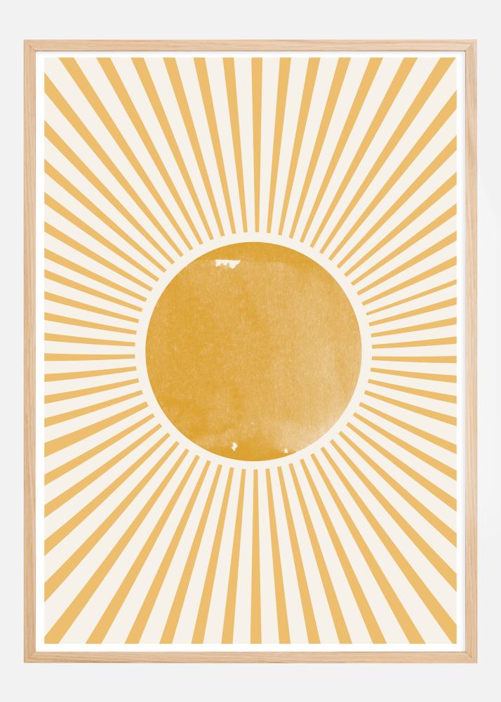 Šis gyvybingas plakatas sukuria spindinčios saulės jausmą su savo auksiniais linijų spinduliais, supančiais centrinį geltoną apskritimą minkštoje baltoje fone. Dizainas įkvėptas bohemiškų ir geometrinių raštų, kurie kartu sukuria saulės šilumos ir energijos įvaizdį. Šiltos spalvos ir spindintis raštas sukurti tam, kad suteiktų džiaugsmo ir pozityvumo jausmą.