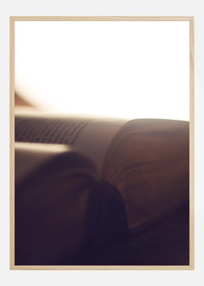 Stambus planas plakatas su atversta knyga. Balta šviesa užpildo didžiąją dalį šio vaizdo, nes ji šviečia ant knygos su paauksuotais puslapių kraštais. Žodžiai vos matomi, todėl tai puikus spaudinys studijų kambariui.