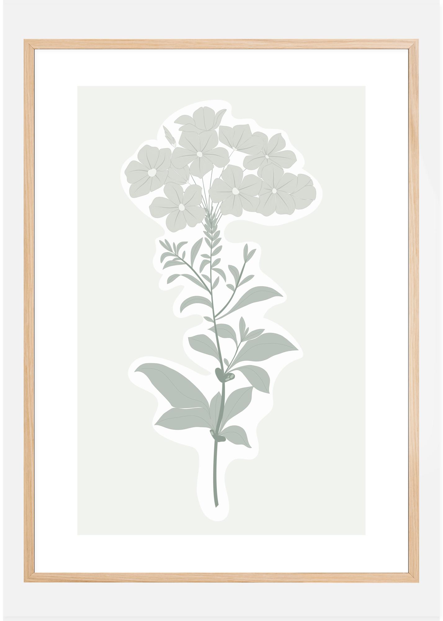 Plakatas su paprastu botanikos atspaudu, vaizduojantis gėlę ir jos lapus. Švelnios pilkai žalios spalvos sudaro šią paprastą, bet vis tiek elegantišką, žiedą turinčią stiebą. Įrėmintas baltai ir pilkai, šis atspaudas sužadina prisiminimus apie senamadiškas botanikos iliustracijas. Parodykite savo sodo dalelę naudodami šį žavų atspaudą.