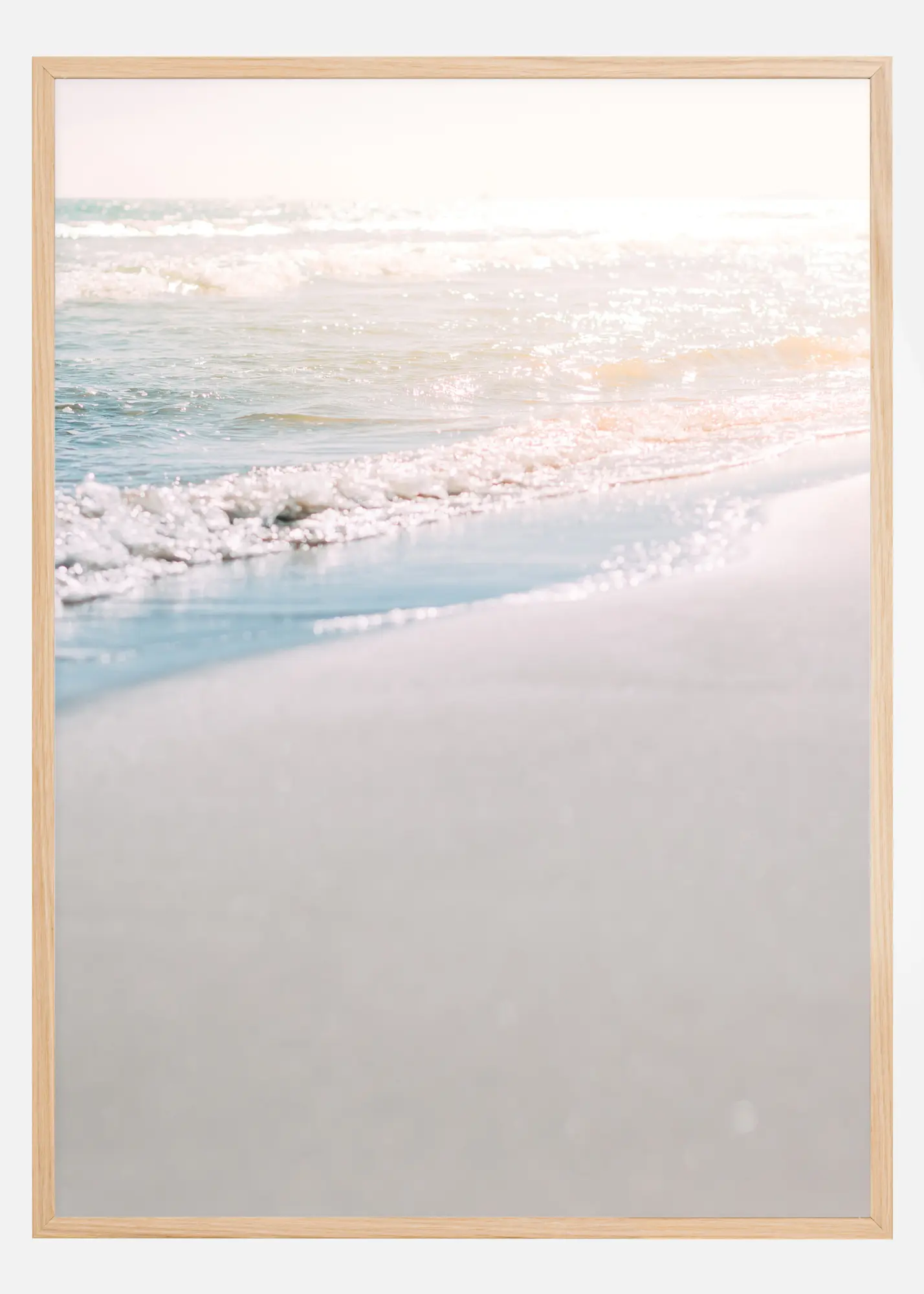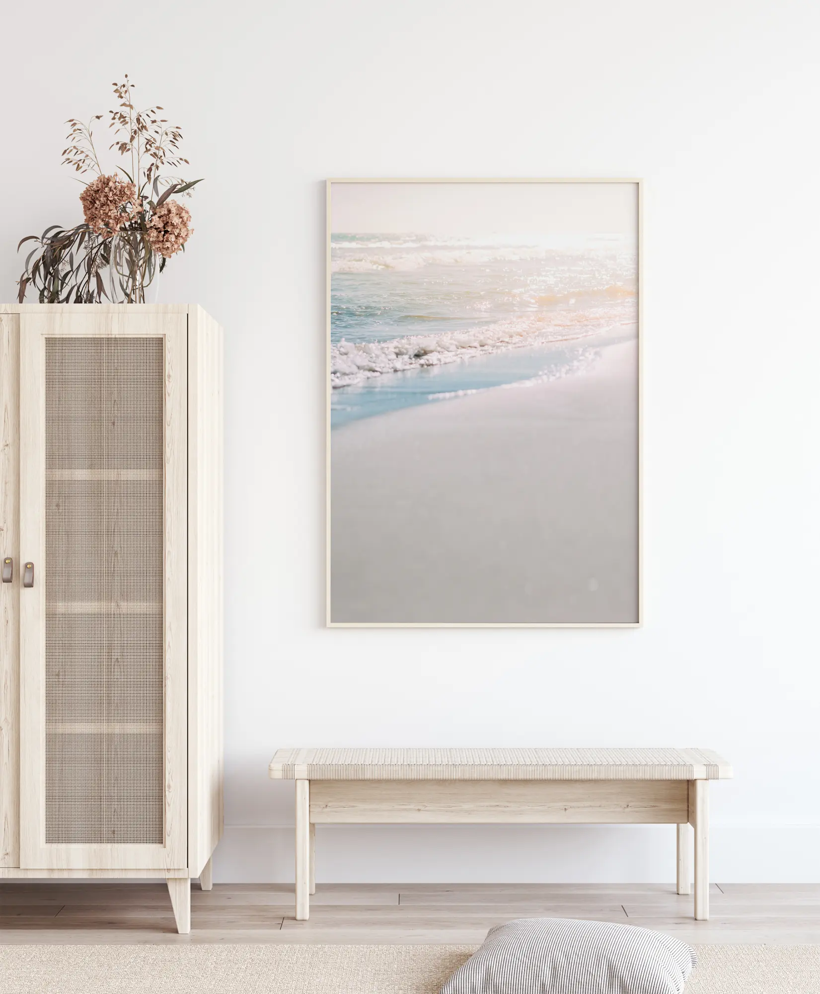 Stambaus atspaudas su bangomis, trenkiančiomis į lygią smėlio paplūdimio dalį, kol ankstų rytą per vandens paviršių spindi balta šviesa, suteikianti magišką jausmą. Švelnūs mėlynos, rožinės ir geltonos spalvų atspalviai daro šį kūrinį tobulu priedu miegamajame.