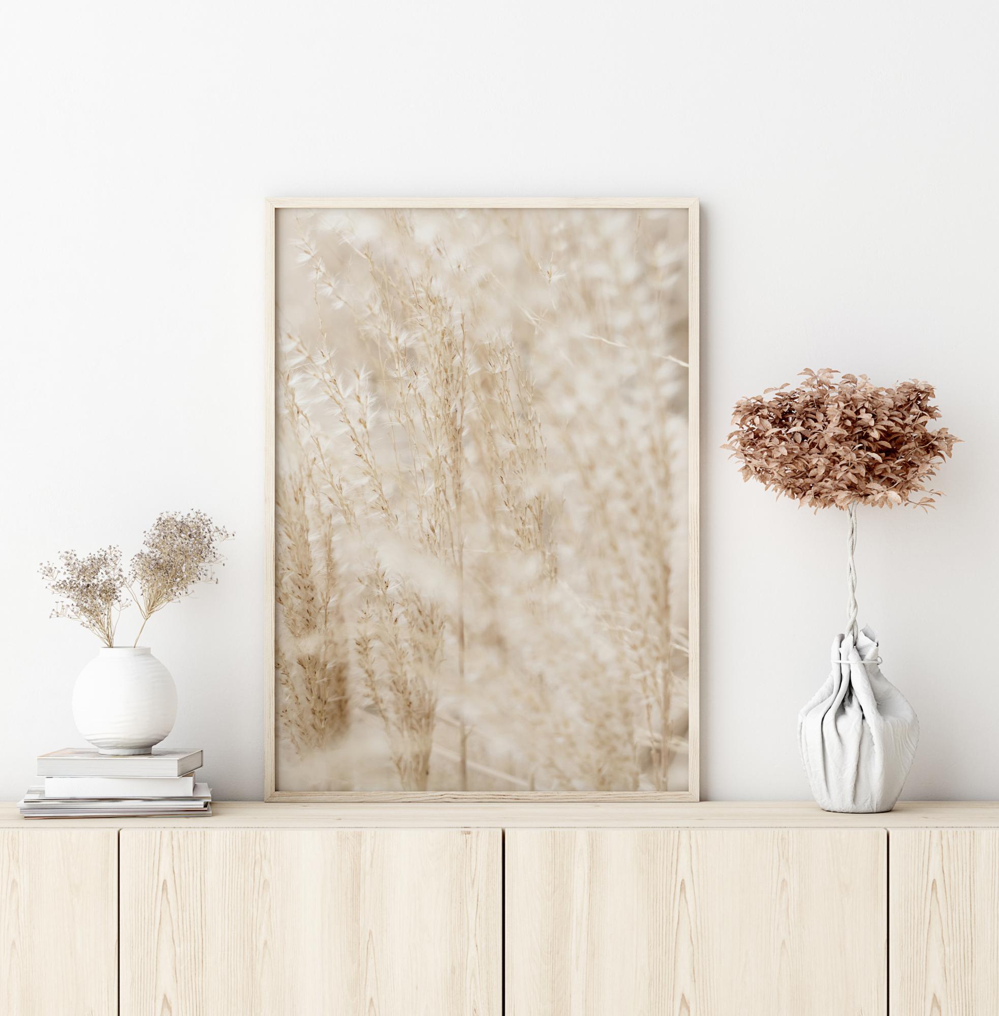 Švelniai auksinės spalvos plakatas su lauku. Vaizdas yra atpalaiduojantis, kviečių varpos subtiliai sufokusuotos, švelnūs galai apšviesti beveik angeliško baltumo šviesa. Norint suteikti raminančią, eterinę išvaizdą, tai yra puikus kūrinys, kurį galima pakabinti ant kurios nors namų kontrastuojančios sienos.