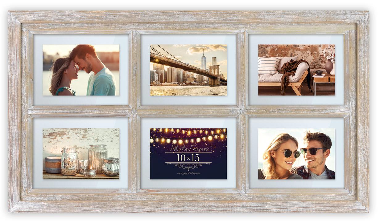 Horizontali koliažo rėmelis iš šviesios medienos. Tai rėmelis, kuris talpina 6 nuotraukas, kurių dydis yra 10x15 cm, ir leidžia lengvai sugrupuoti nuotraukas kartu puikiu būdu. Rėmelis turi šiek tiek medžio dekoracijų, suteikiančių jam rustišką, bet tuo pačiu ir kaimišką charakterį. Rėmelio išoriniai matmenys yra 38,5x69,5 cm. Yra sieninis tvirtinimas.