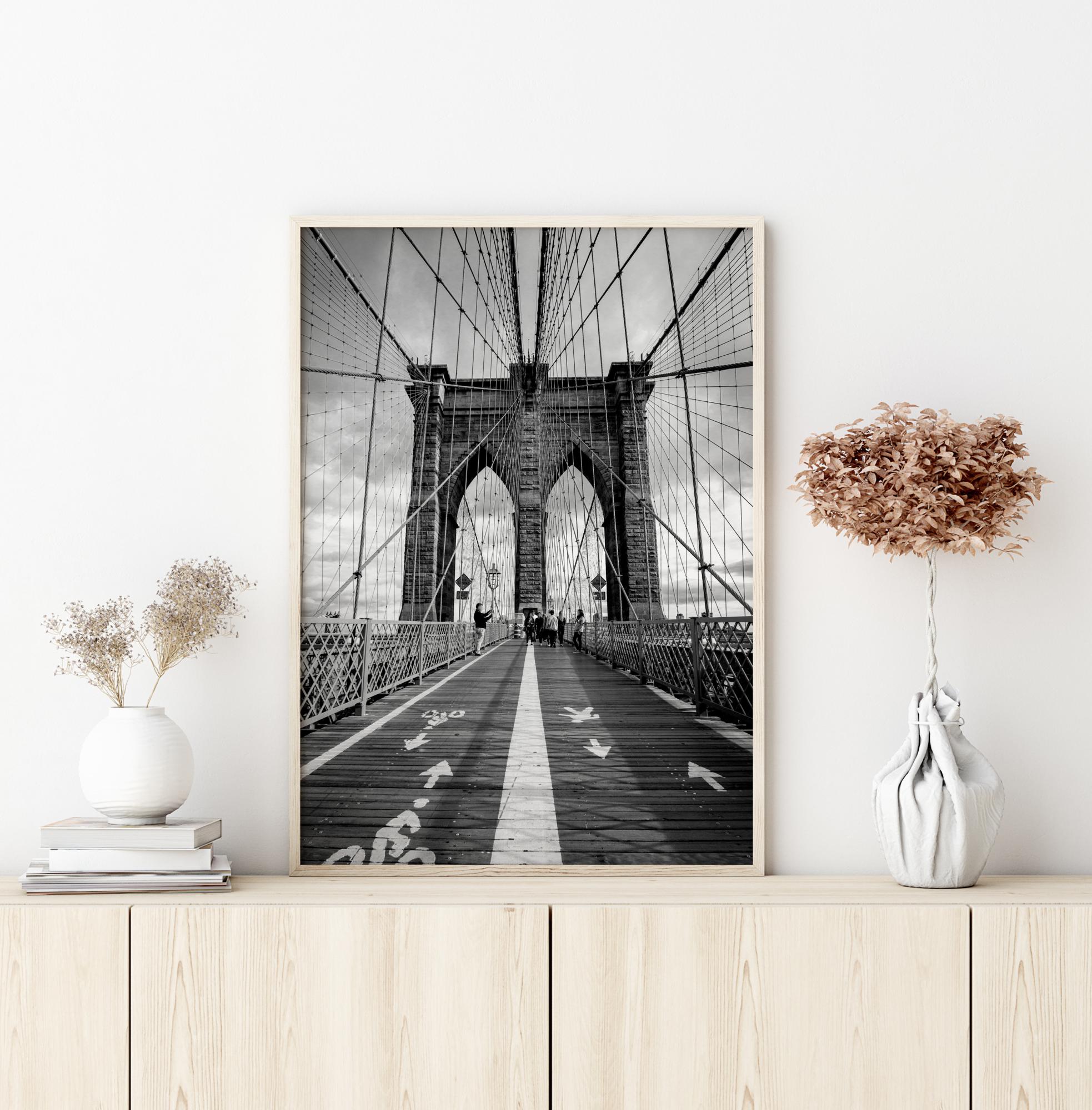 Juodai balta nuotrauka, vaizduojanti Bruklino tilto pėsčiųjų taką, įspūdingus bokštus ir įdomų plieninių trosų pakabos mechanizmą didelėmis tinklo akimis. Plakatas, kuris puikiai atrodo kartu su kitais mėgstamais kūriniais didesniame koliaže.