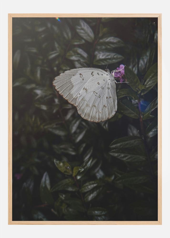 Atraskite gamtos tylų grožį per šį mąslų plakatą, vaizduojantį ramiai besiilsinčią delikačią drugelę. Jis elegantiškai patalpintas ant vešlios tamsiai žalių lapų fono, o jos blyškiai balti sparnai su subtiliais pilkos ir juodos spalvos raštais paryškina jos trapumą ir grakštumą. Šis vaizdas yra ramus priminimas apie trumpalaikes ir kerinčias gamtos akimirkas.