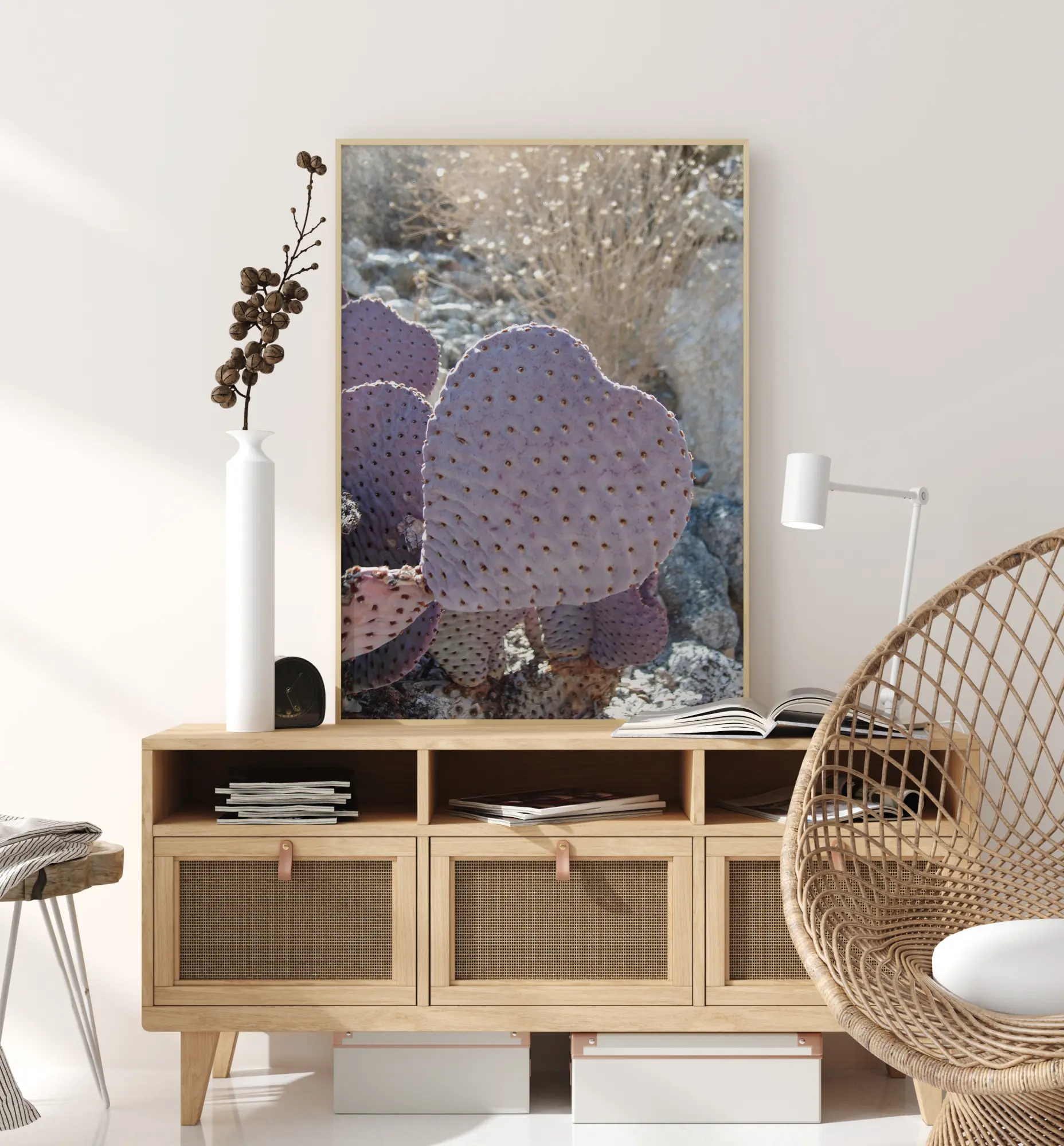 Magiškas plakatas su širdies formos kaktusu. Ankstyvos ryto šviesos spindi fone ir apšviečia mažas gėlytes, panašias į kalėdines lemputes ant krūmo. Didžiulis širdies formos kaktusas yra dėmesio centre su savo įdomiu taškų raštu, kuris sukuria eterinį vaizdą.