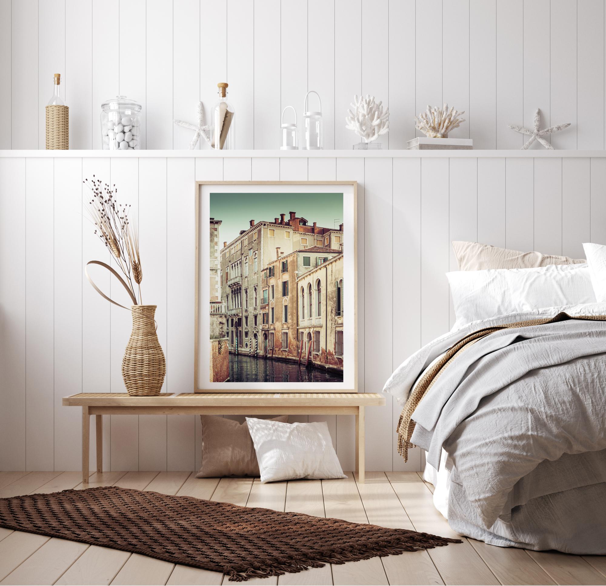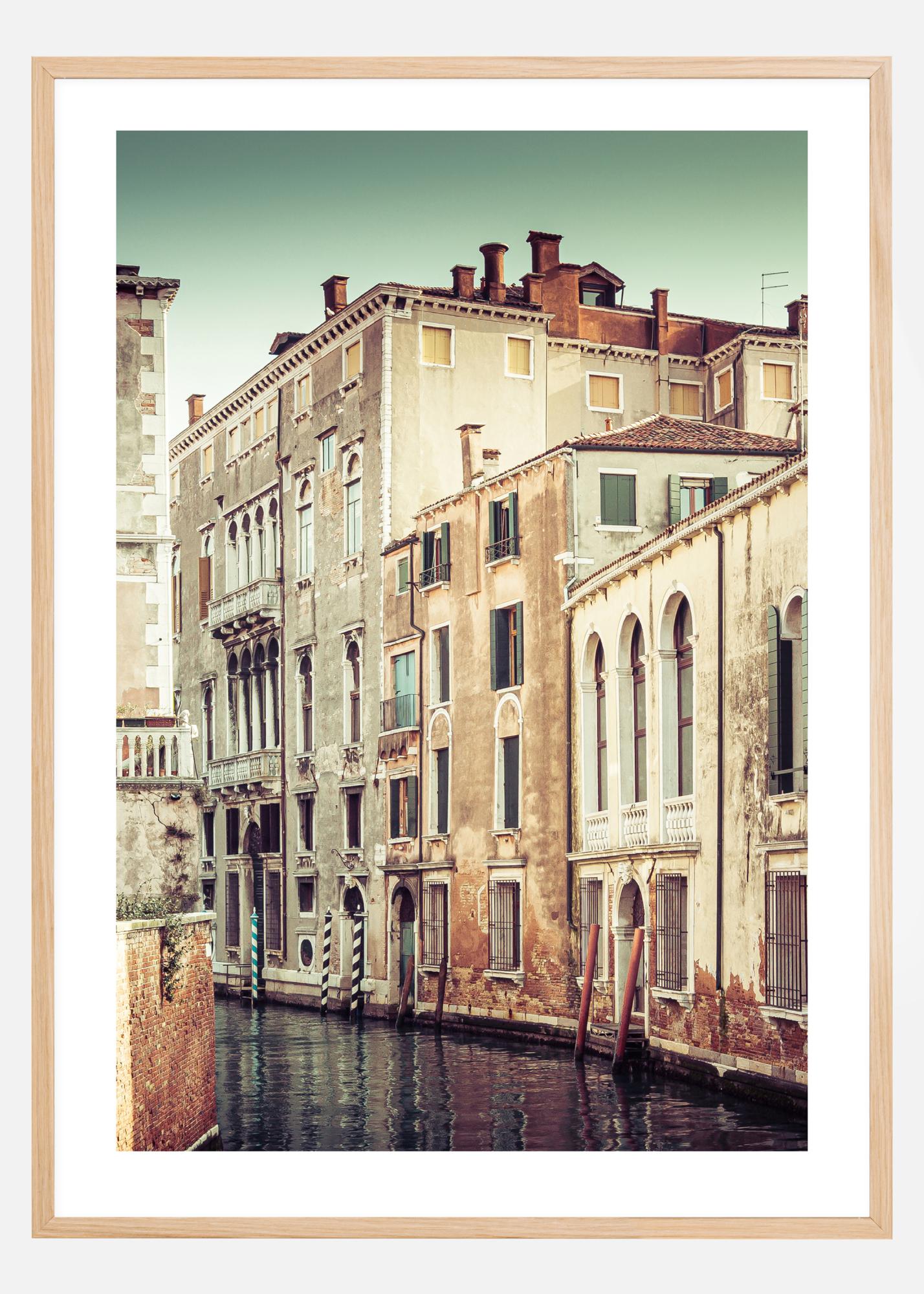 Plakatas su Venecijos kanalu. Pasteliniai atspalviai sukuria švelnų pastatų vaizdą, apjuosdami tamsesnį kanalą. Švelniai mėlynas dangus piešia namus viršuje. Leiskitės į kelionę į šį nuostabų miestą, pakabindami šį kūrinį savo namuose.