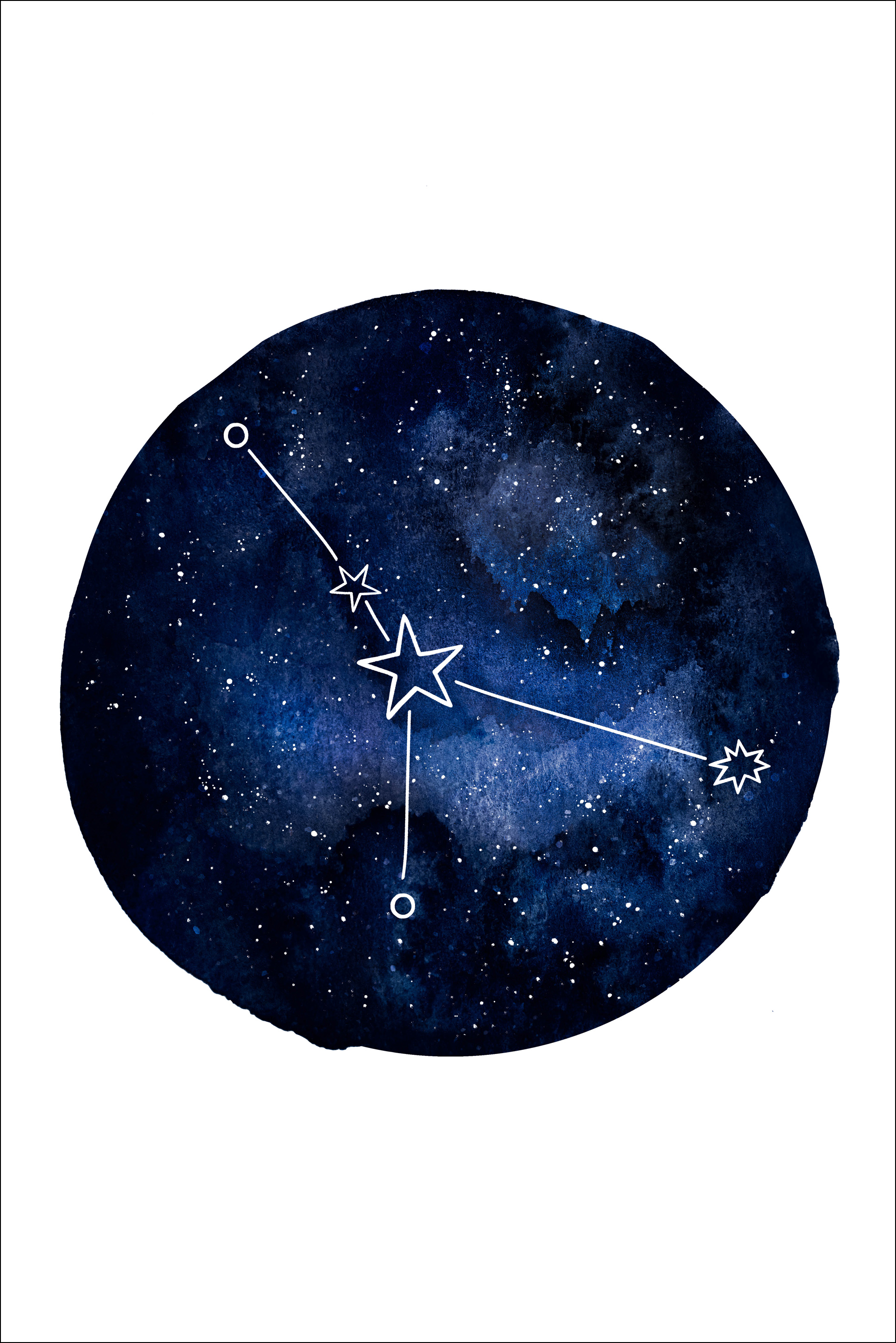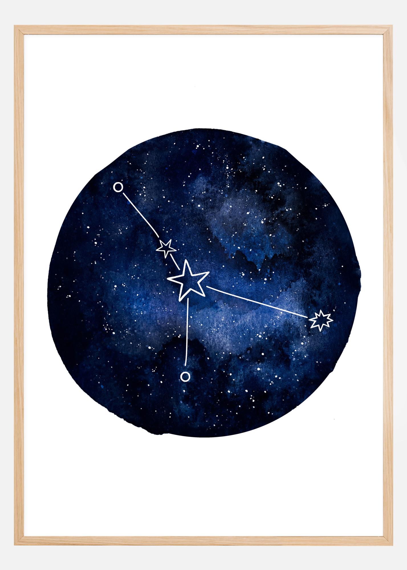 Horoskopo plakatas su Vėžiu. Tamsiai mėlynas apskritimas užpildo šio balto vaizdo centrą. Apskritime yra skirtingi mėlynos atspalviai bei įvairios žvaigždės. Vėžio žvaigždynas yra ryškus centre. Jeigu mylite savo žvaigždyną, šis vaizdas yra būtinas ant jūsų sienos.