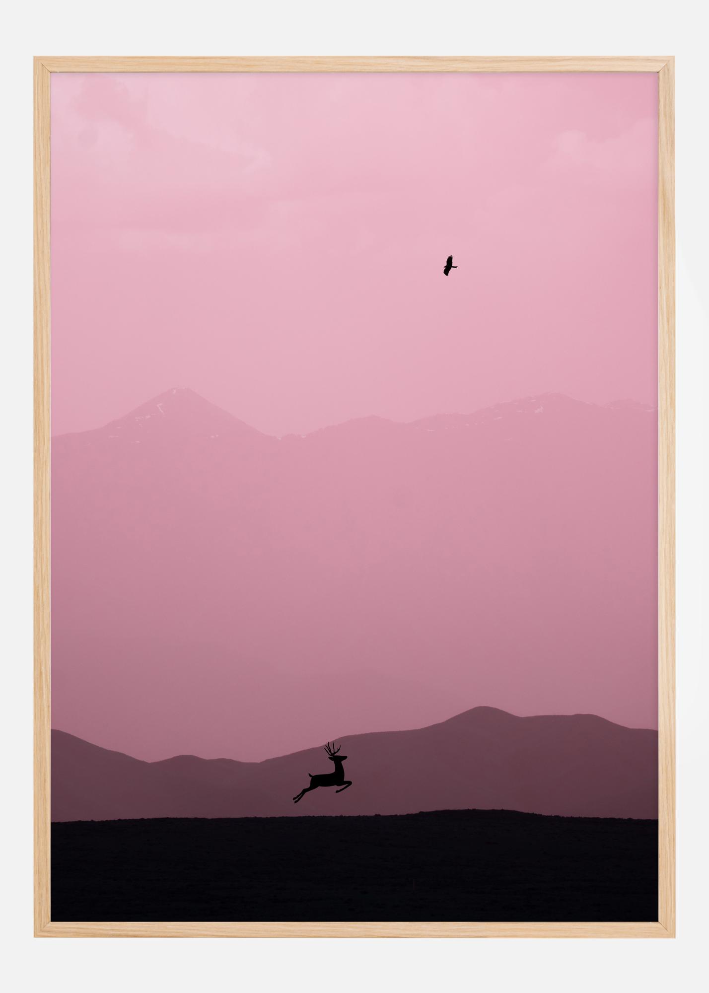 Šis ramus ir svajingas plakatas perteikia laisvės ir grožio gamtoje esmę. Siluetas elnio, pagauto šuoliuojant per švelniai banguojančių kalvų siluetą, suteikia judėjimo ir lengvumo jausmą. Visa tai dengia švelniai rožinis dangus, suteikiantis šilumos ir pasakiškumo jausmą. Vieniša paukštė skrenda link begalinio dangaus, pridėdama papildomą laisvės ir neribotumo dimensiją prie vaizdo.