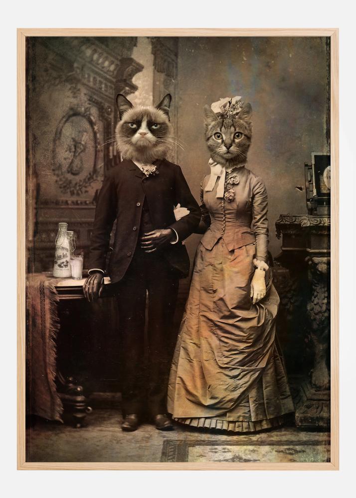 Komiksinis plakatas, rodantis kačių porą, vilkinčią Viktorijos laikų drabužius. Surūgusi katė ir jo nuotaka dėvi visišką Viktorijos laikų madą, įskaitant kostiumą ir korsetą šiame sepijos spaudinyje. Įneškite juoko į savo namus su šiuo paveikslu jūsų svetainės sienoje.