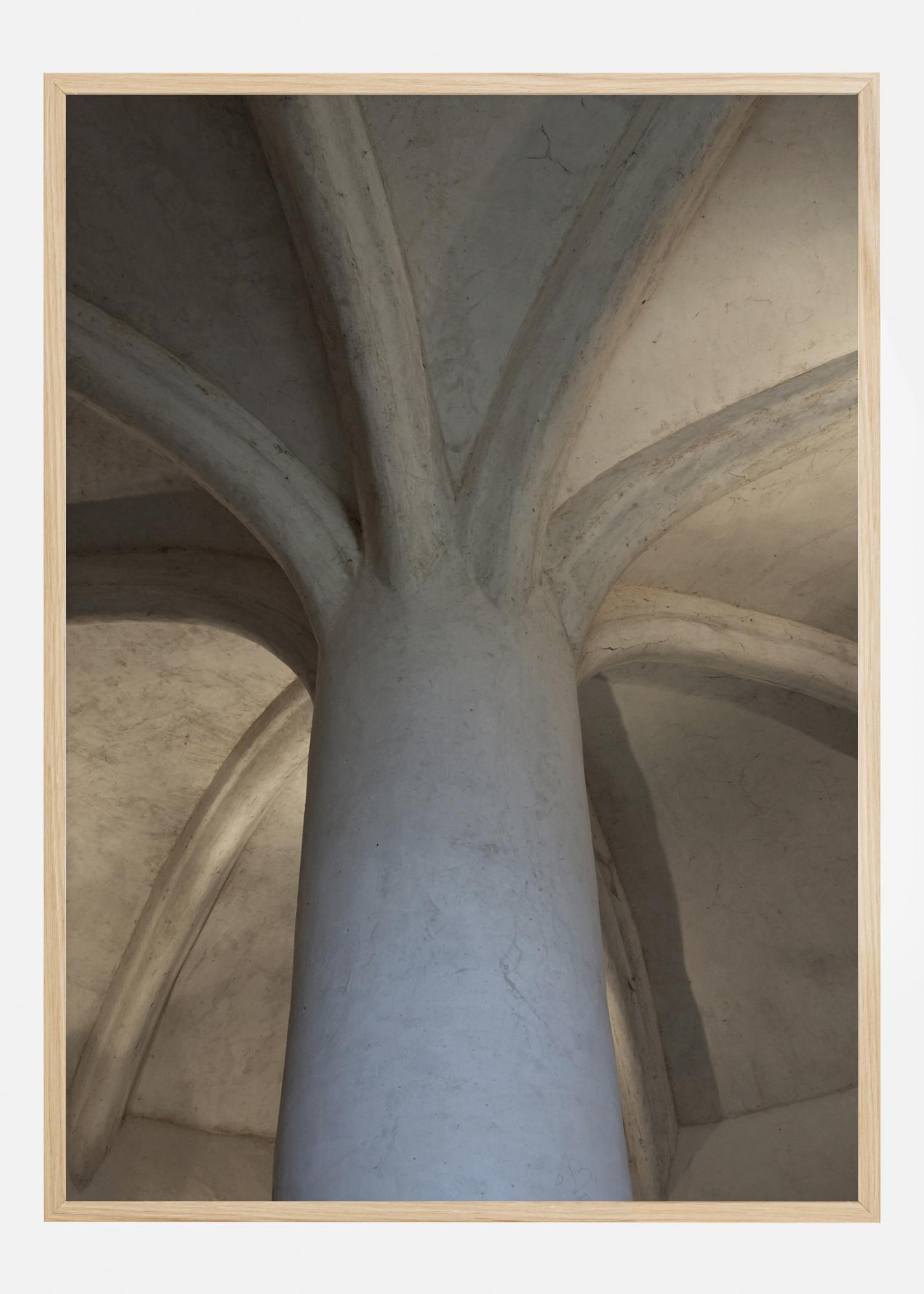 Architektūrinis plakatas su koplyčios ar bažnyčios stogo vidumi. Vienintelė kolona stovi viduryje ir siekia lubas, kur aštuoni skliautai išsiskiria kaip gėlė. Vėsus akmuo sukuria didybės jausmą, kurį galite mėgautis namuose.