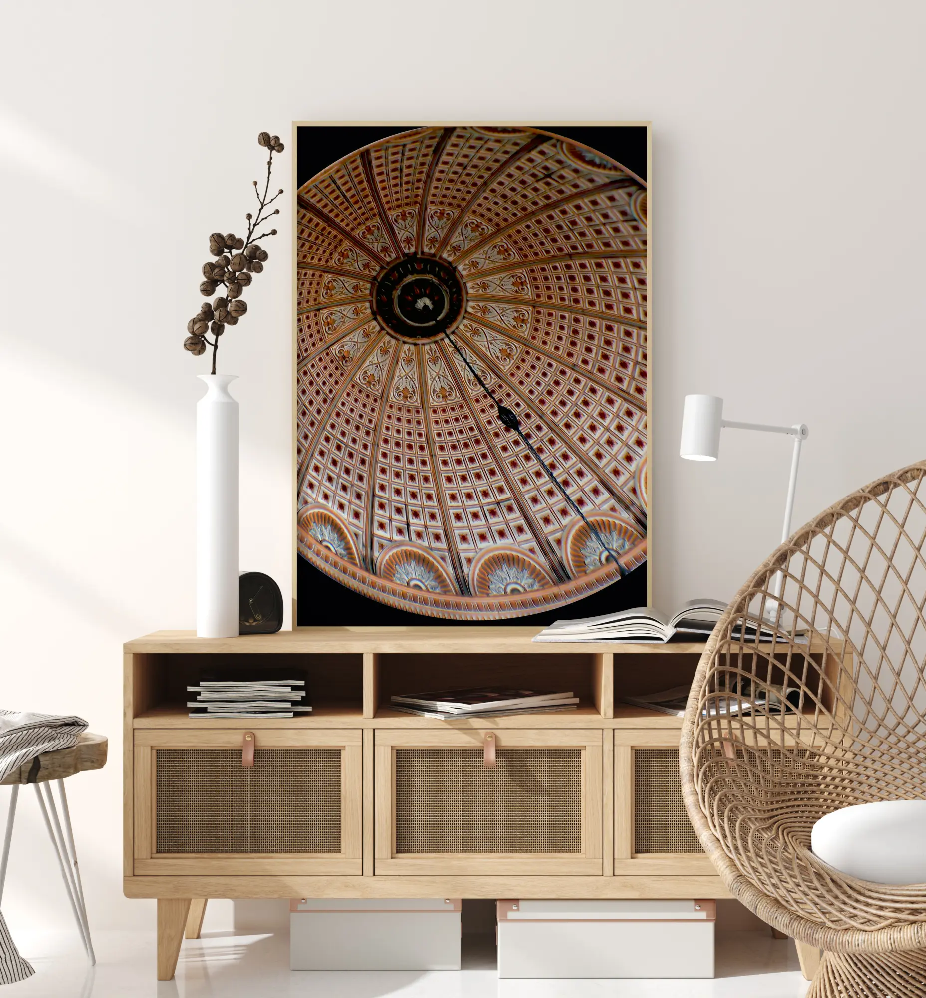 Interjero plakatas su nuostabiai suprojektuota lubomis. Žvelgiant į šį raudonos ir auksinės spalvos kupolą galima jausti beveik svaiginantį efektą. Sekite apskritimus ir linijas šiuose sudėtingai raštuotuose lubose ir stebėkitės statybos įgūdžiais. Pakabinkite šį kūrinį ant paprastos sienos, kad detalės išryškėtų dar geriau.