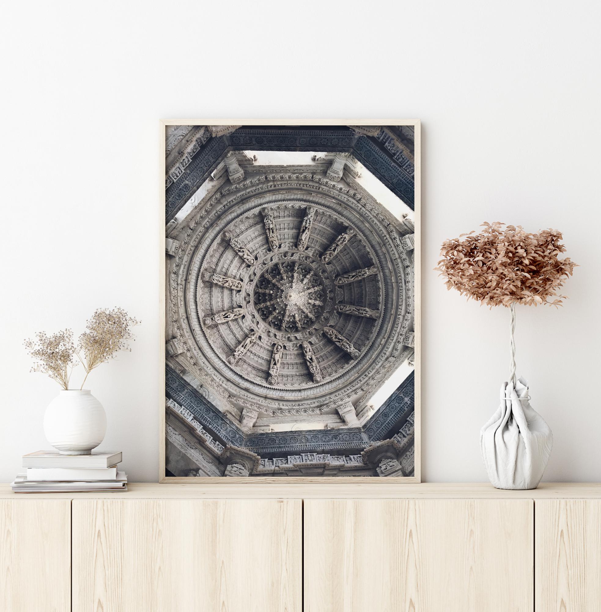 Juodai balta plakatas su pilku stogu. Stogas suprojektuotas su apskritimais ir atrodo kaip laivo ratas. Apsuptas aštuonkampio, jis turi geometrines formas visur. Suteikite švelniai mėlynai sienai šiek tiek daugiau gyvybės pakabindami šį stogo plakatą.