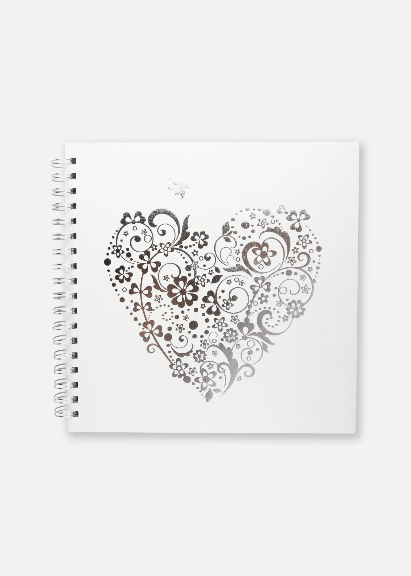 Žavingas, spirale įrištas albumas baltos spalvos, kurio dydis yra 18x18 cm. Priekyje yra sidabrinė širdis su gražiomis gėlių detalėmis. Albume yra 24 rūgščių neturinčių baltų lapų ir tai yra puikus albumas, kurį galima laikyti patogiai, kad galima būtų peržiūrėti neužimant daug vietos.