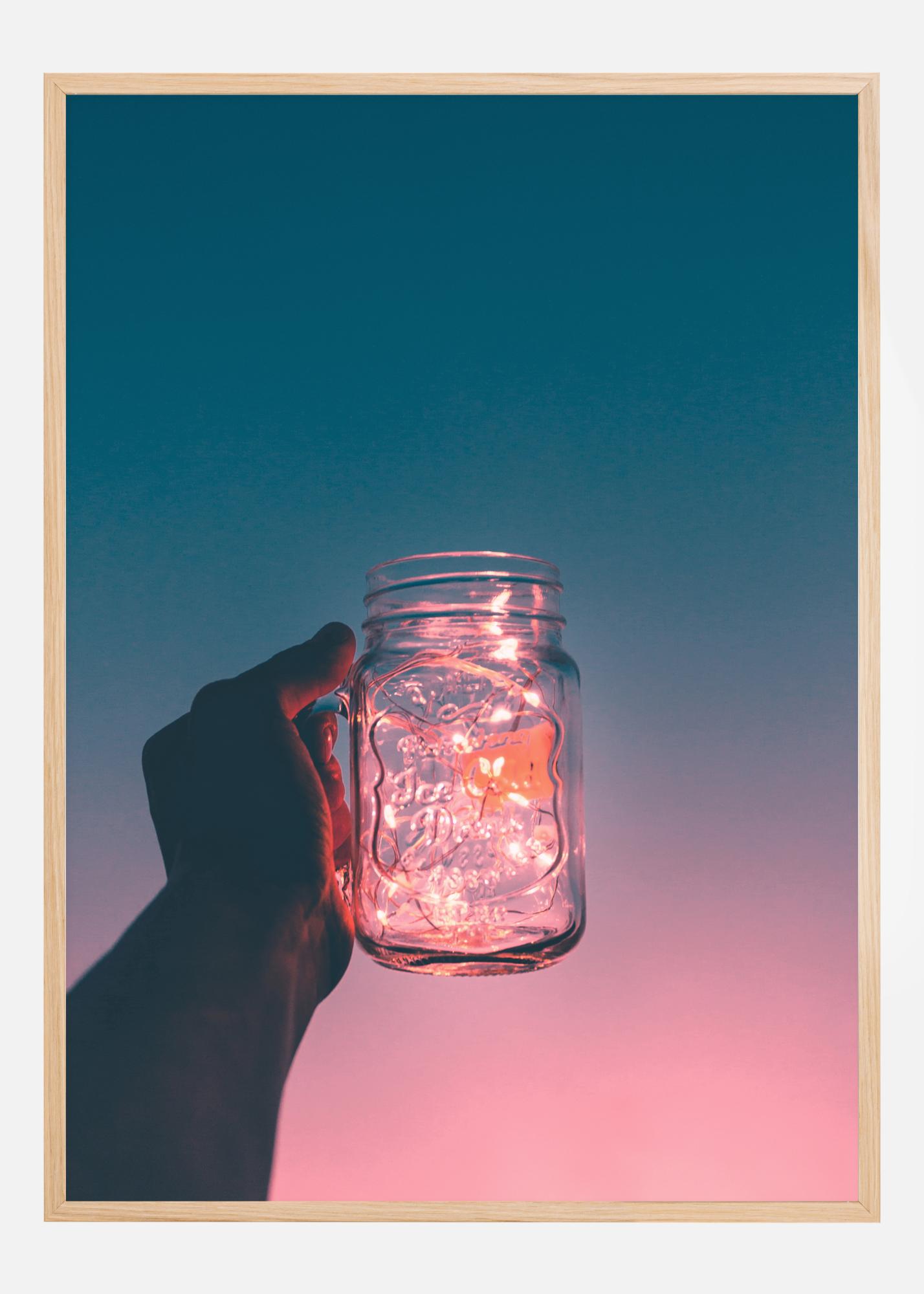 Gražus plakatas su ranka, laikančia stiklinį puodelį su LED žibintu. Išnaudokite magišką atmosferą, kurią sukuria švelniai mėlyna ir rožinė fonas, suteikiantis kūriniui tikrą fantazijos jausmą. Pakelkite savo stiklinę šiam vaizdui ir pajuskite džiaugsmingą jausmą, kurį suteikia šis plakatas.