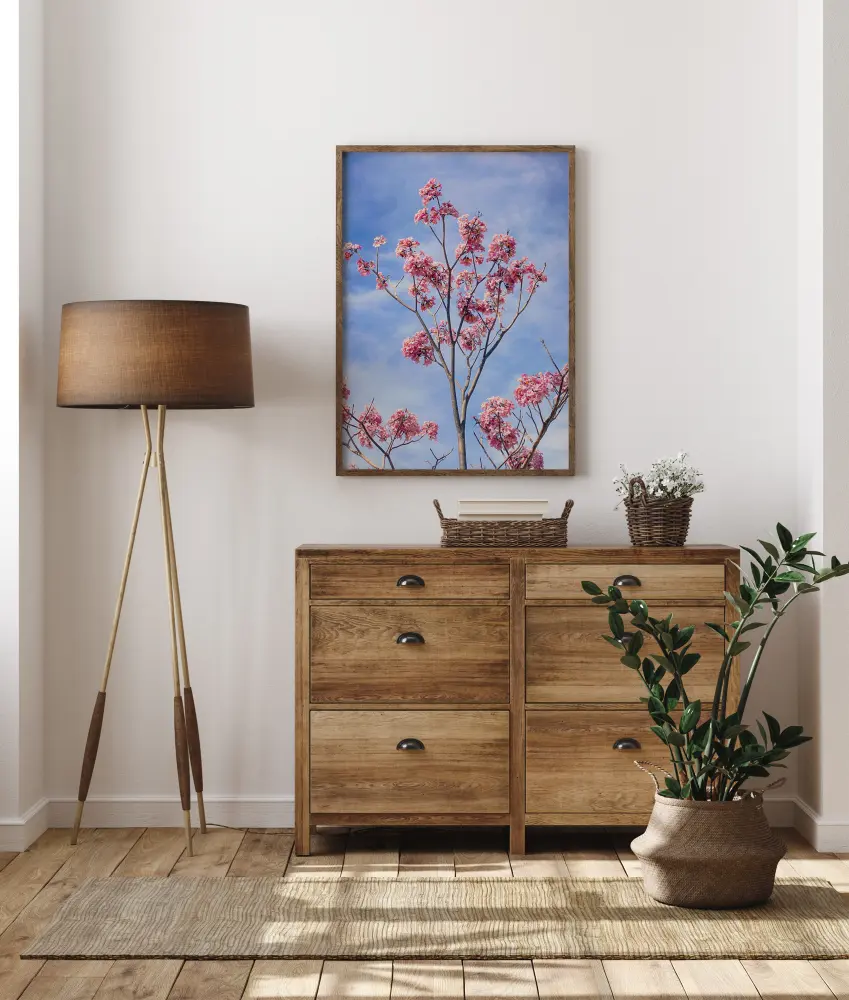 Stiprus plakatas su ilgomis rožinių vyšnių žiedų šakomis. Tiesios šakos siekia dangų ir yra padengtos ryškiais rožiniais žiedais, kurie ryškiai išsiskiria mėlynu dangaus fonu. Suteikite savo namams gamtos pojūtį su šiuo vaizdu savo namuose.