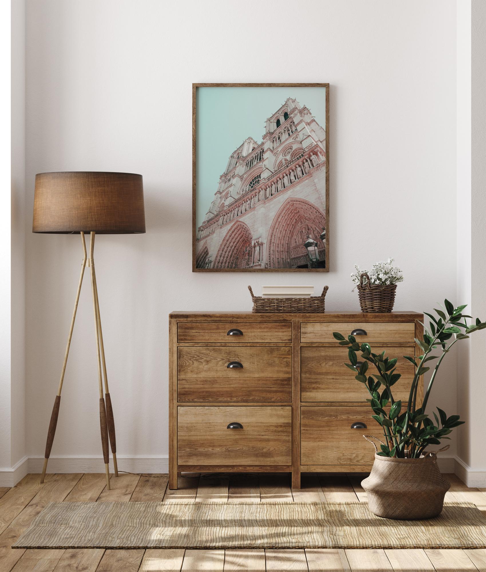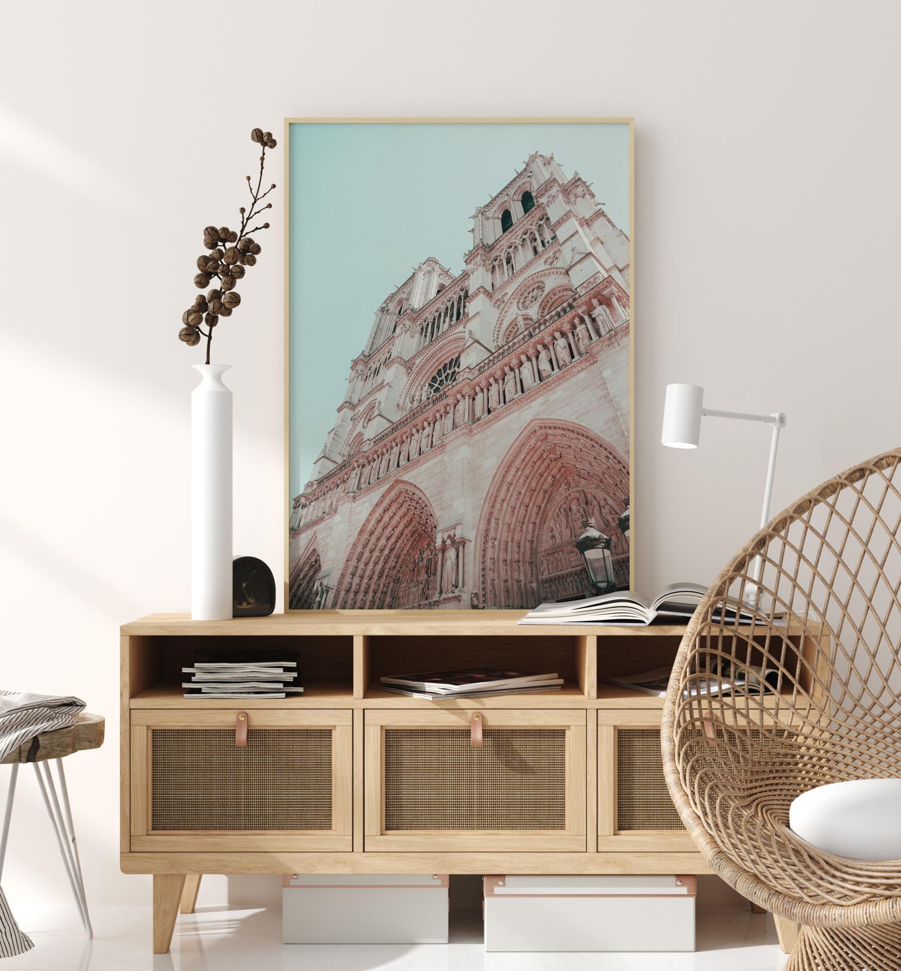 Įspūdingas plakatas su bažnyčios fasadu. Pažvelkite į viršų išilgai šio balto ir rožinio pastato su gotikinėmis arkadomis, akmens statulomis ir apvaliais langais. Švelnūs pasteliniai atspalviai sukuria harmoningą jausmą, puikus būdas sukurti raminančią atmosferą namuose.