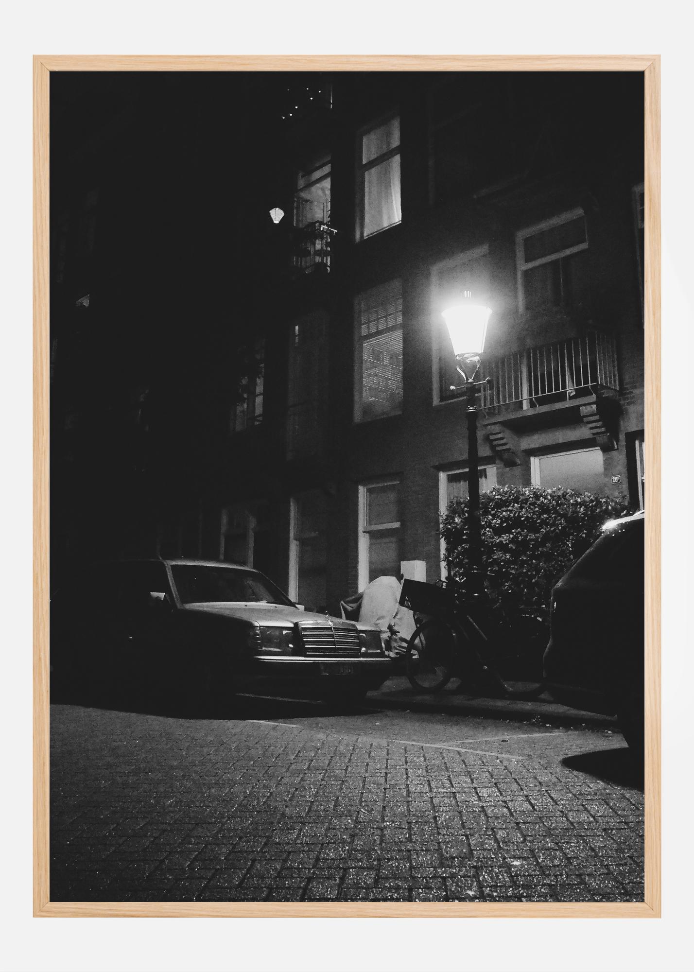 Šis intriguojantis plakatas suteikia žvilgsnį į miesto gyvenimą, kai nusileidžia naktis. Vieniša gatvės lempa nuplauna šaligatvį ir stovinčius automobilius švelniu, šiltu švytėjimu. Motyvai užfiksuoti monochromine palete, kuri sustiprina kontrastus ir šios ramios miesto vaizdo detales. Šis spaudinys puikiai tinka įnešti ramybės ir apmąstymo jausmą į bet kurį kambarį, primenant ramias akimirkas kitaip pulsuojančiame miesto ritme.