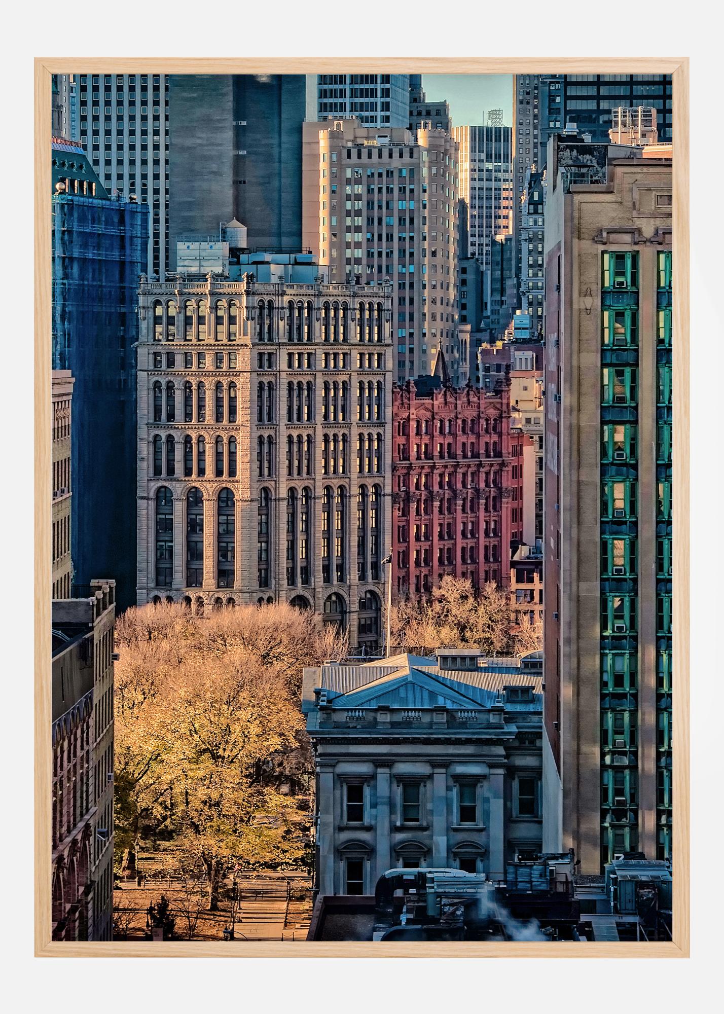 Urbanistinis peizažas su senais ir naujais pastatais. Rudens medžiai ir raudoni plytiniai pastatai puikiai kontrastuoja su šaltesniais mėlynais dangoraižiais. Įsivaizduokite, kad žiūrite pro savo langą į šią judrią miesto vietą, kol turite šį paveikslą namuose.