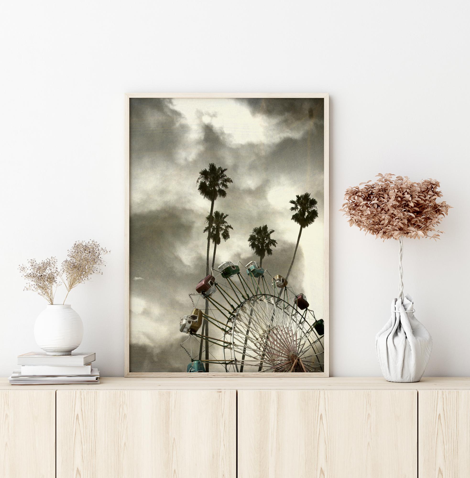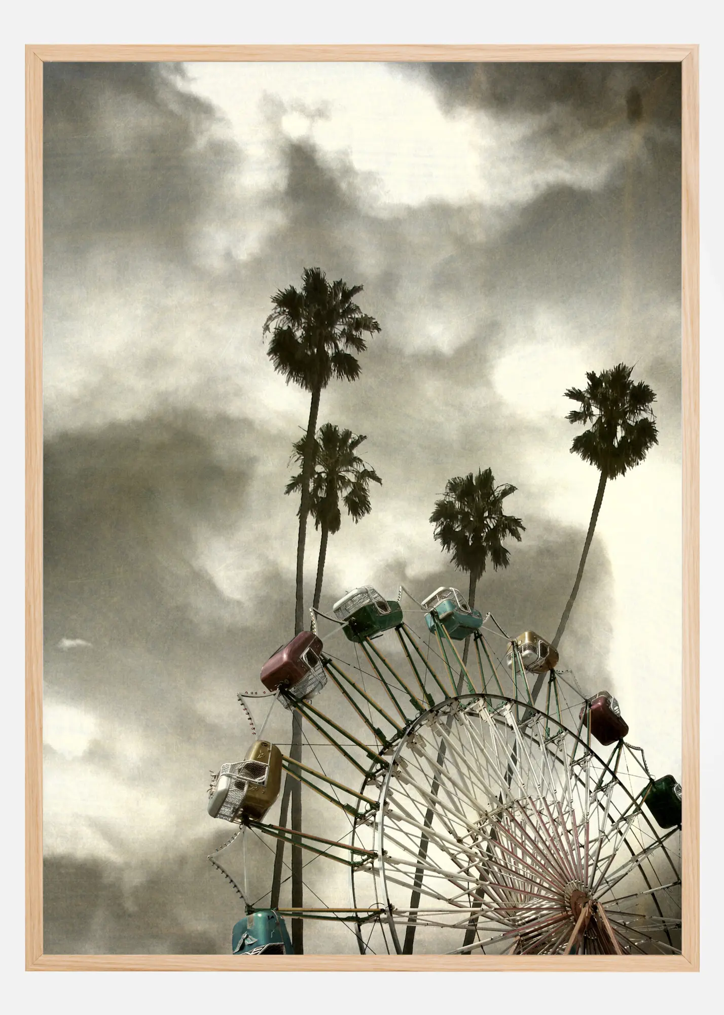 Fotografinis plakatas su paryžietiško rato formos karusele, kurios vagonai yra sodrių pastelinių spalvų, palmėmis ir dramatišku dangumi fone. Gražus plakatas su daug jausmo.