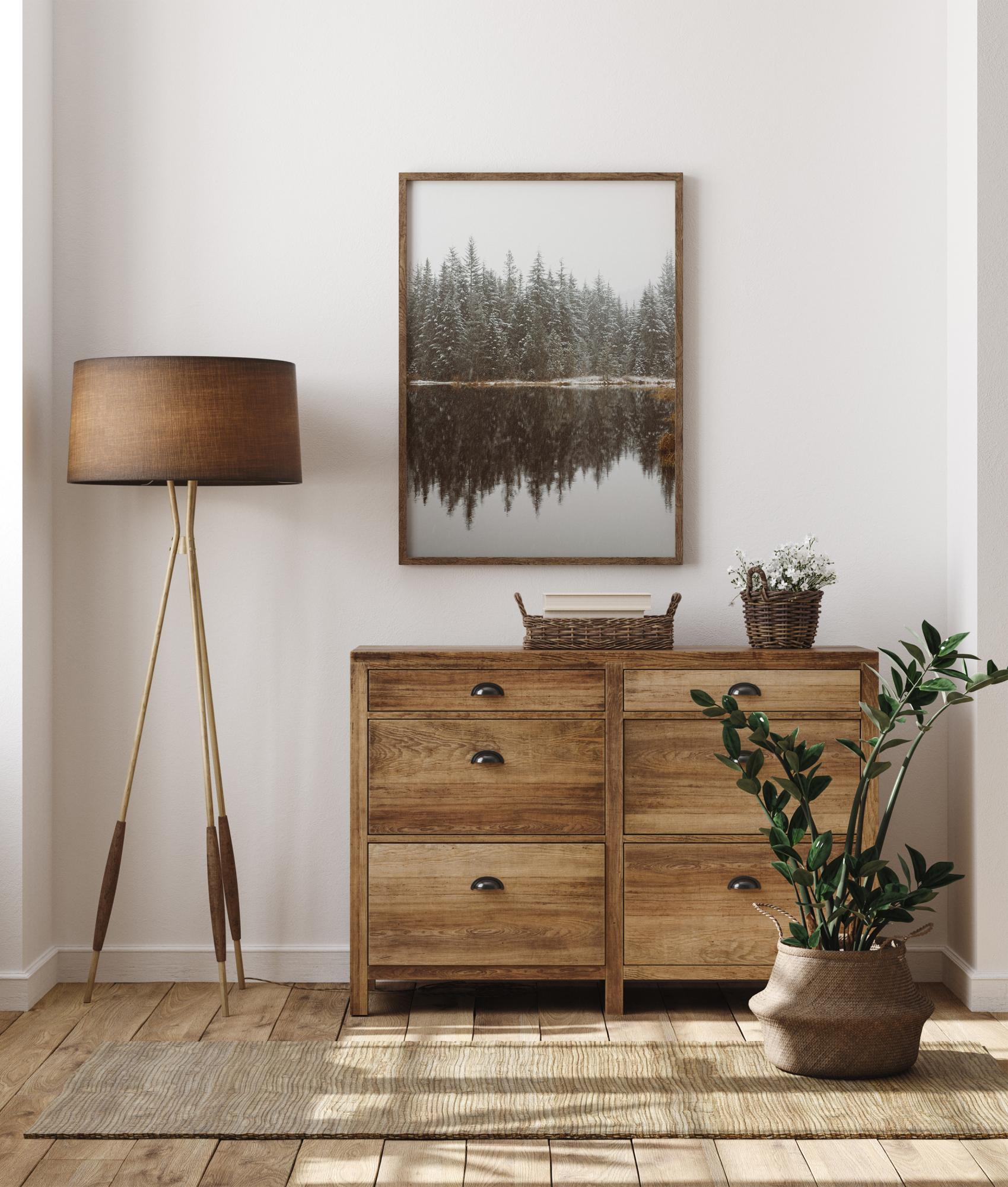 Kalėdinis plakatas su sniegu padengtomis eglėmis ant ežero kranto. Eglės meta tobulus atspindžius ežere, kurdamos ramią, tačiau vėsią sceną. Atsineškite žiemą į savo namus su šia nuostabiai gražia gamtos nuotrauka ir džiaukitės šiluma būdami viduje.