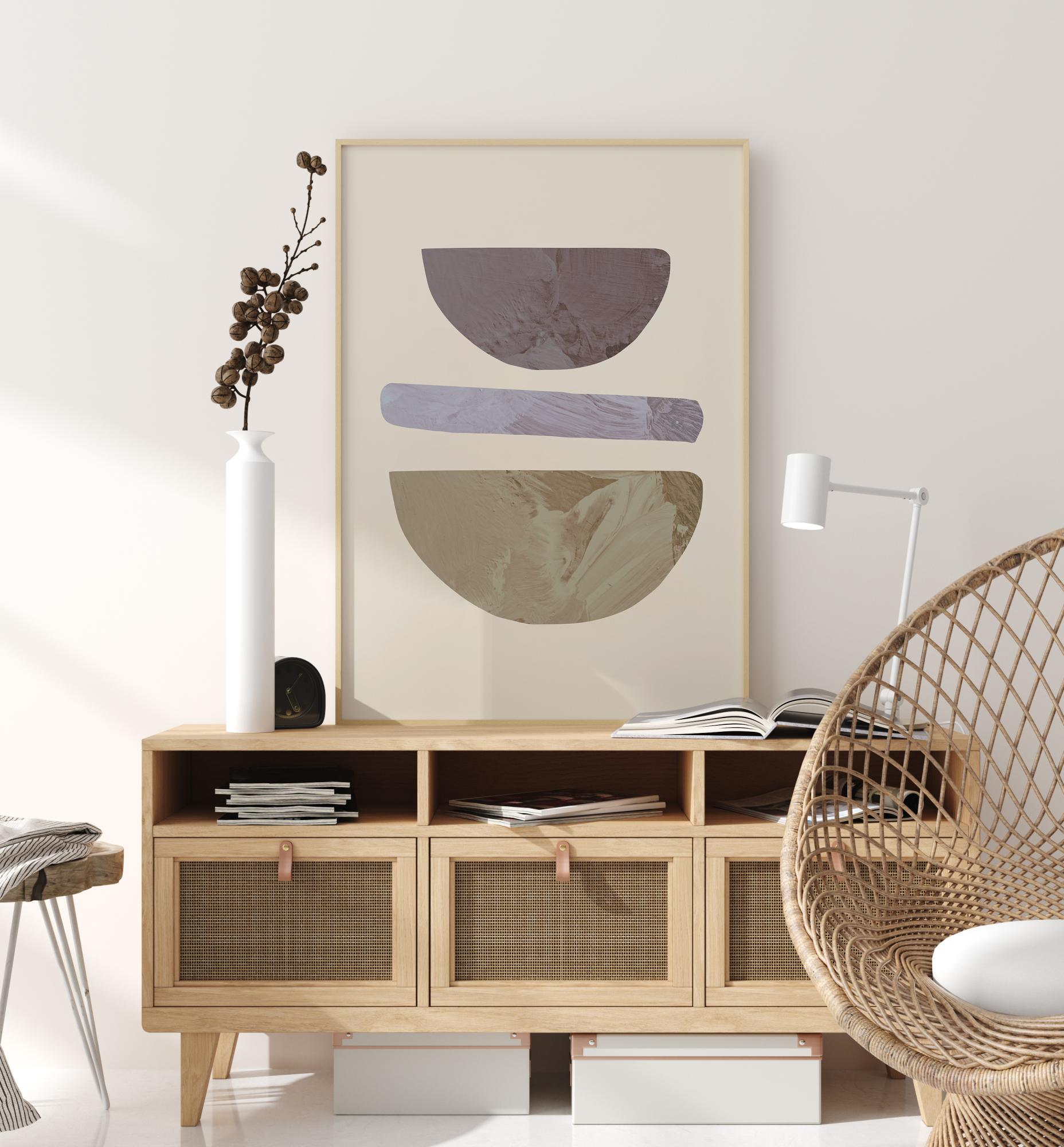 Abstraktus plakatas su trimis išskirtinėmis formomis, sudarytomis iš skirtingų spalvų linijų. Didelis kreminės ir smėlio spalvos puslankis yra apačioje su plonu mėlynu ruožu virš jo. Viršuje yra kita pilkos ir mėlynos spalvų puslankis. Pakabinus šį kūrinį savo prieškambaryje, tai taps neišvengiama pokalbio tema.