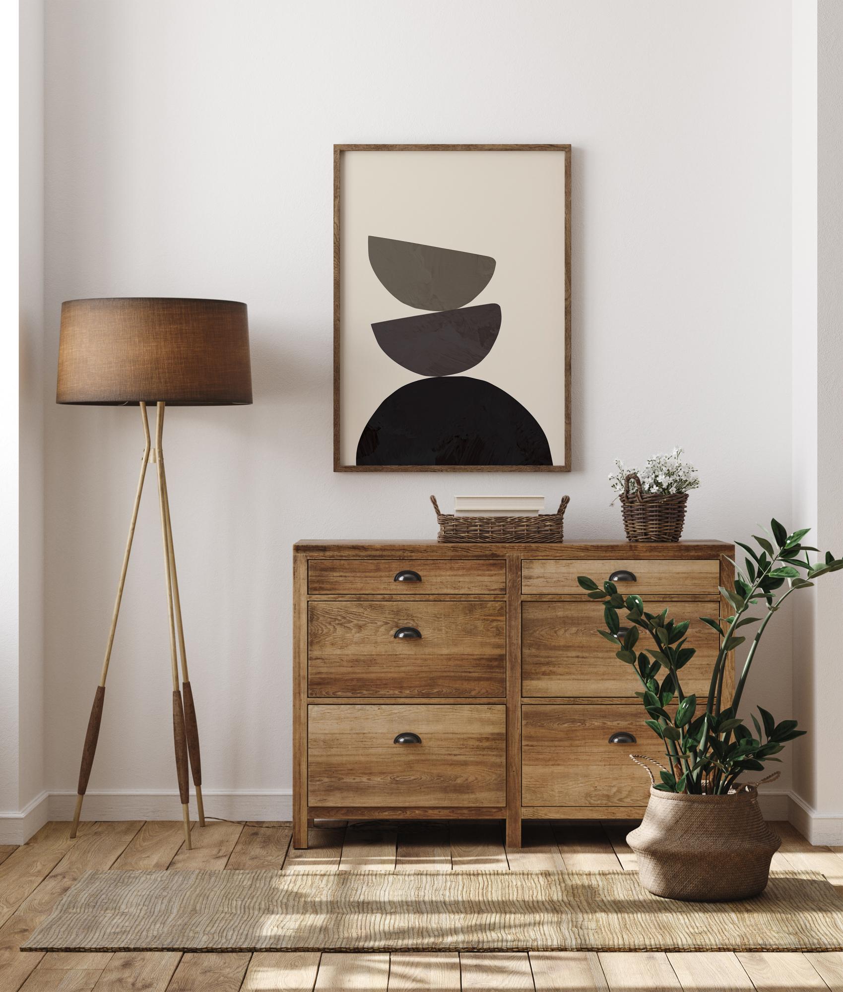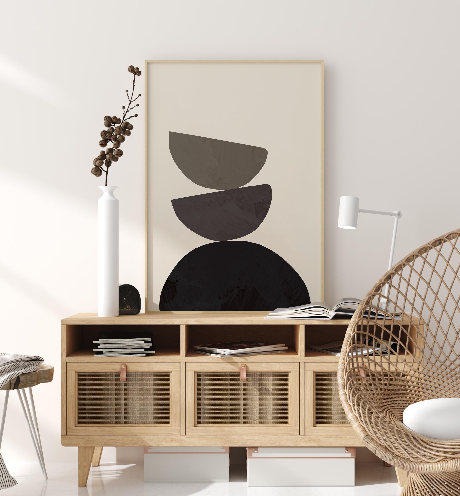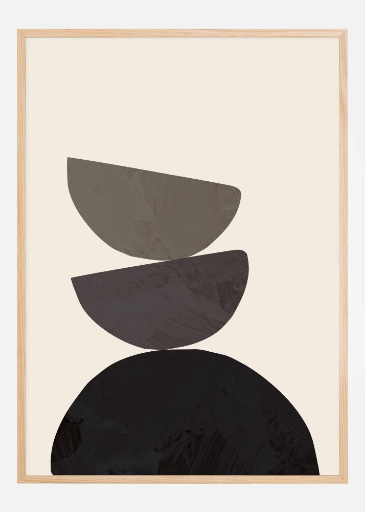 Plakatas su trimis sukrautais pusapvaliais, kurie balansuoja vienas ant kito. Apačioje yra juodas pusapvalis su dviem į viršų nukreiptais pusapvaliais skirtingų pilkų atspalvių. Mėgaukitės neįtikėtinai subalansuotomis formomis, kai pakabinsite šią nuotrauką ant šviesiaspalvės sienos.