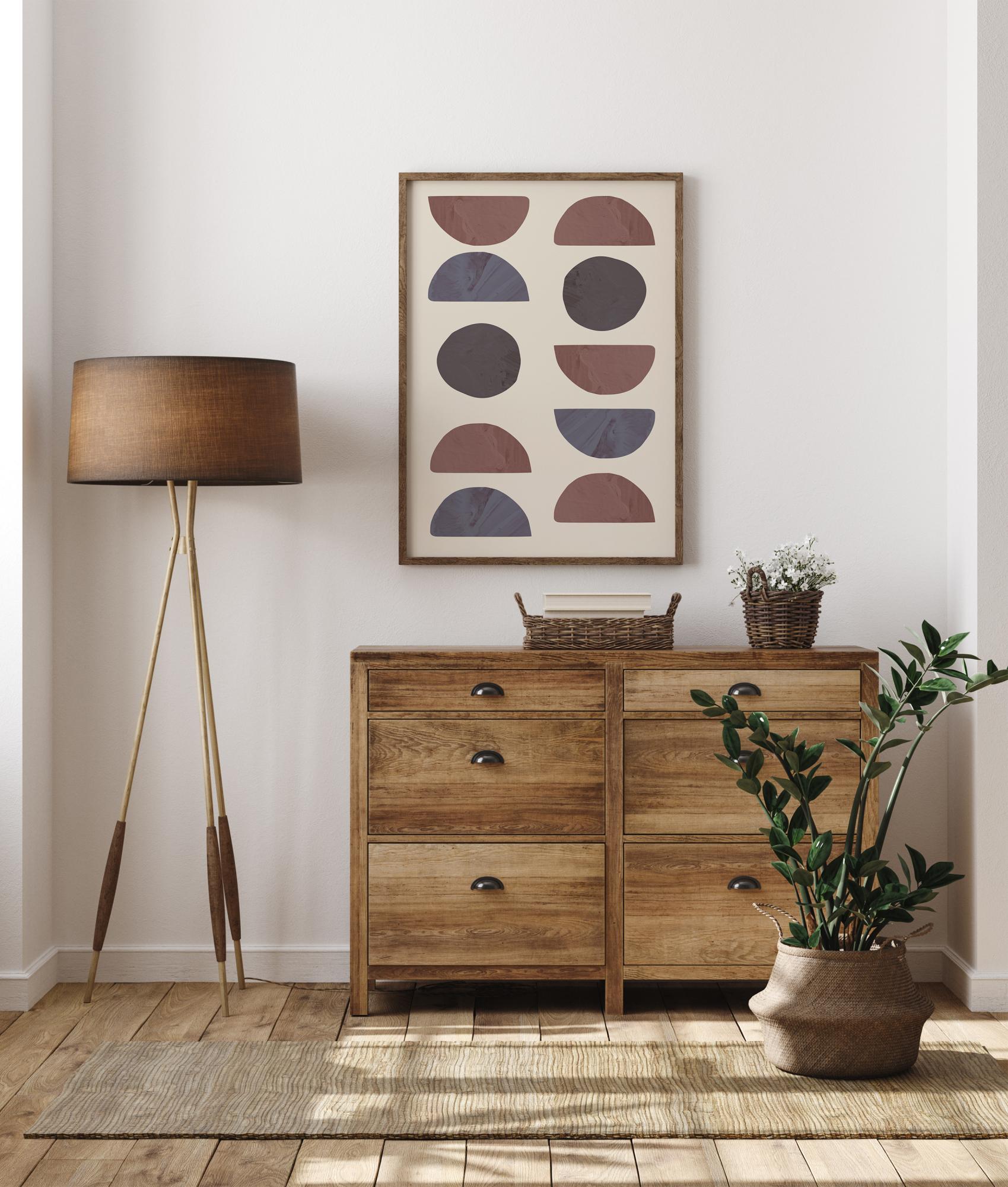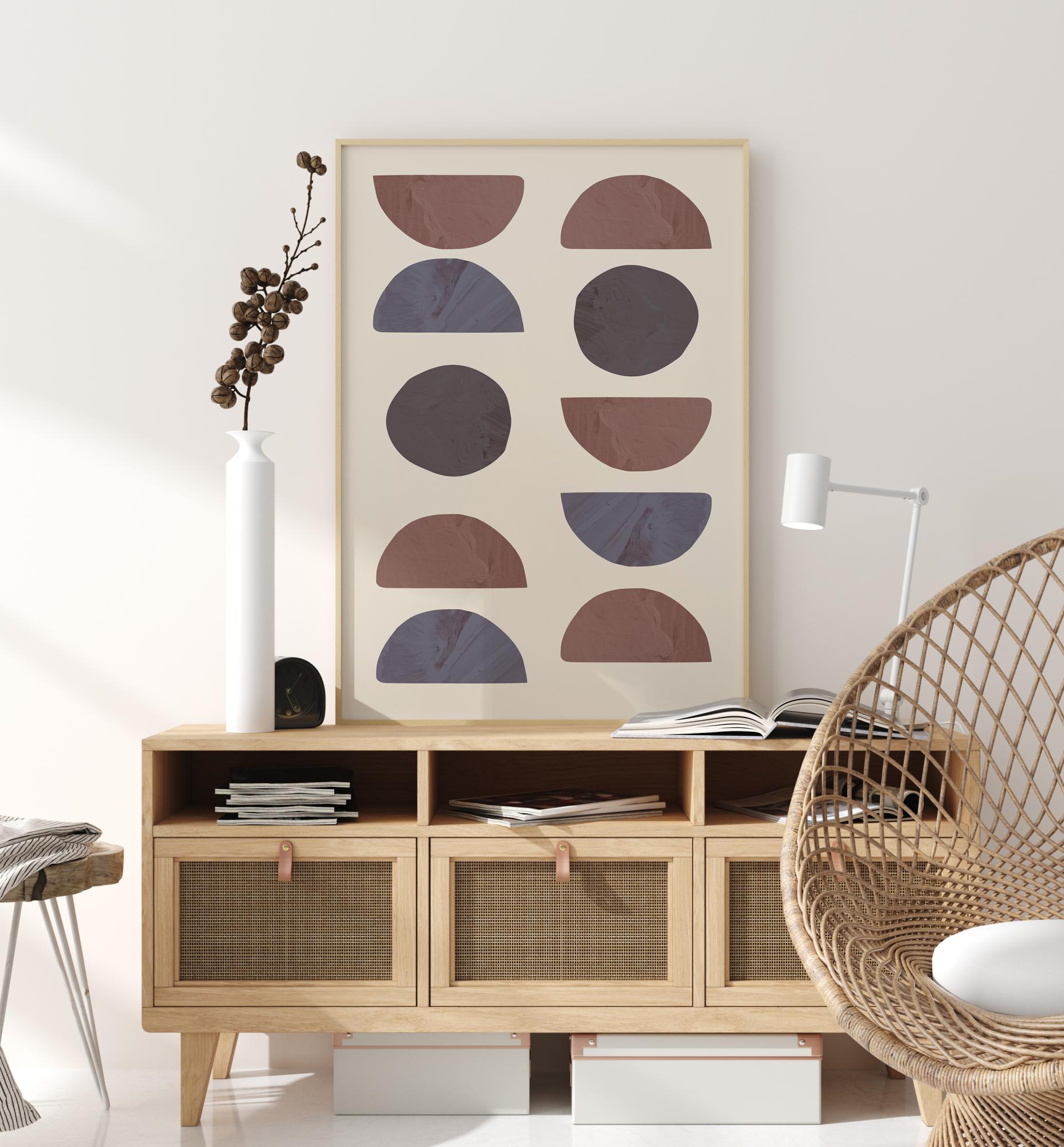 Abstraktus plakatas, užpildytas įvairiais pusapvaliais ir apskritimo formomis. Yra dvi eilės formų su skirtingais apskritimų ir pusapskritimų raštais, viskas įvairių mėlynos, pilkos ir raudonos atspalvių. Praskaidrinkite paprastą namų sieną šiomis geometrinėmis formomis.