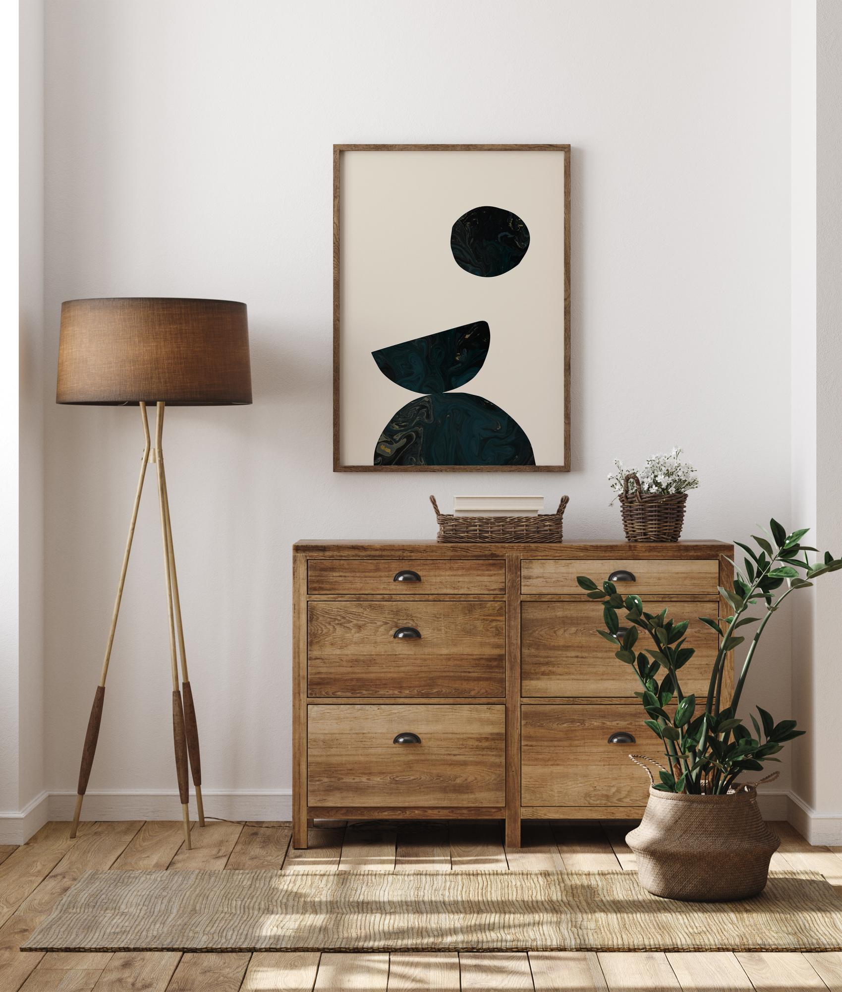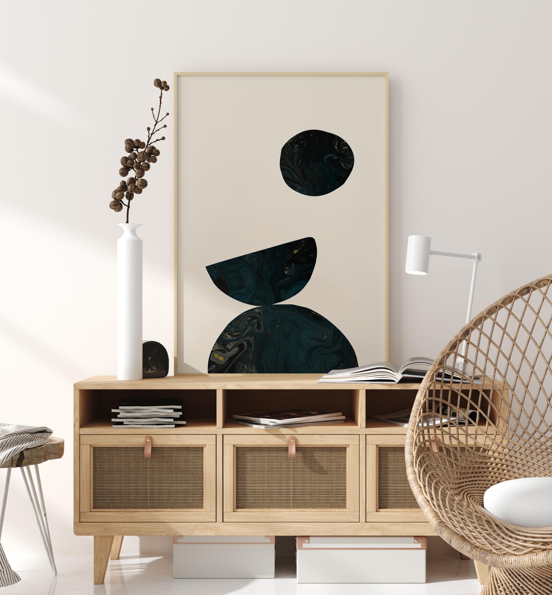 Šviesus plakatas su trijų tamsiai mėlynų ir juodų formų deriniu, kuris sukuria įspūdingą vaizdą. Puslankis yra apačioje ir subalansuoja kitą apverstą puslankį. Viršuje sklando juodas apskritimas. Visa tai yra prieš kontrastingą baltą foną. Derinkite gražius marmurinius sūkurius su blyškesniu sienų atspalviu, kad pridėtumėte daugiau dramos.