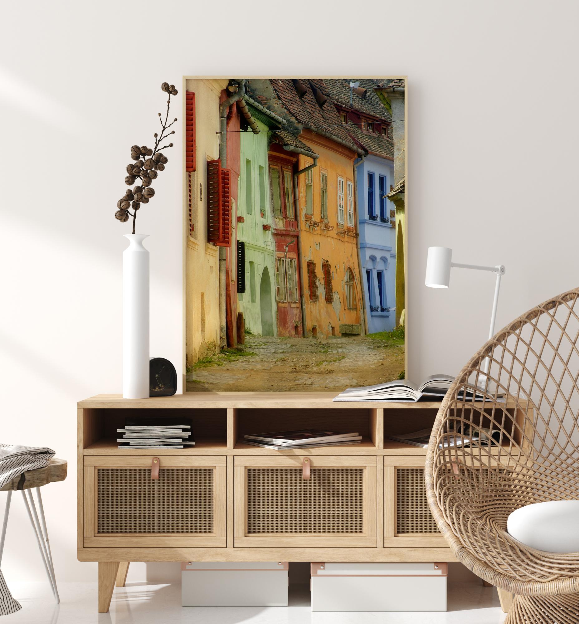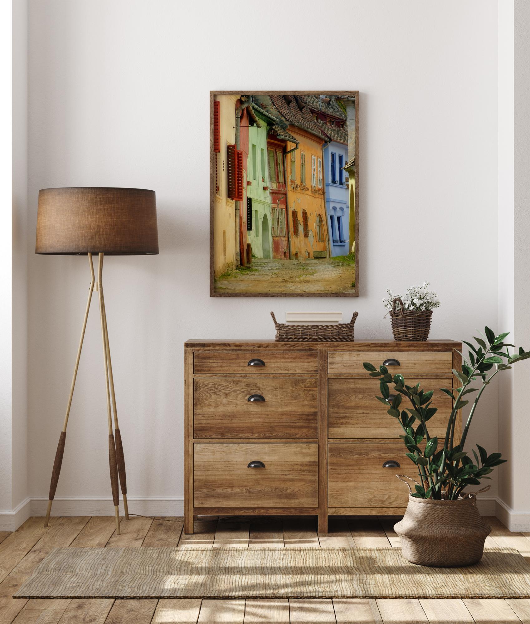 Vaizdingas plakatas su senais, bet spalvingais namais palei siaurą gatvelę. Akmeniniai grindinio akmenys veda tarp smėlio spalvos, žalių, oranžinių ir mėlynų namų su čerpių stogais bei plačiai atvertais raudonais langinėmis. Mėgaukitės vaizdinga, ramia atmosfera šioje patrauklioje vaizdingoje scenoje.