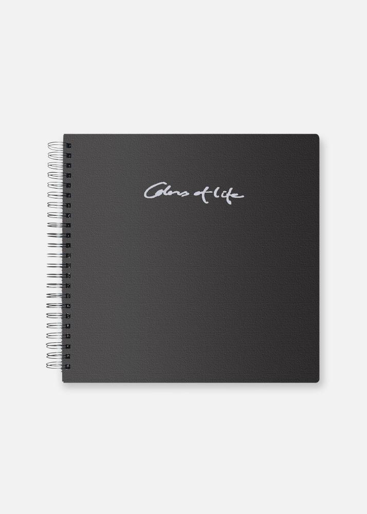 Spiralinis albumas, kurio dydis 30x30 cm, su 24 juodais be rūgščių lapais, paruoštais užpildyti prisiminimais! Ant albumo viršelio sidabru užrašyta "Colors of life".