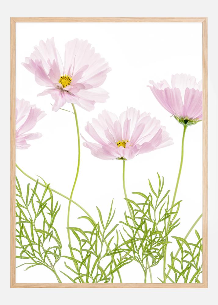 Plakatas su rožinėmis kosminėmis gėlėmis spausdinimo stiliuje. Kiekviena gėlė yra subtiliai violetinė-rožinė su šviesiai geltonu centru. Paprasti žali lapai veda žvilgsnį aukštyn link šių šokančių gėlių. Sukurkite kaprizingą nuotaiką savo namuose su šiuo nuostabiu spaudiniu.