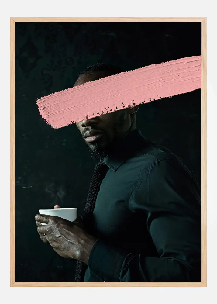 Šis meniškas plakatas vaizduoja profilinį vyrą, laikantį baltą puodelį, su intriguojančia detale, kai jo akys uždengtos svyruojančiu rožiniu potėpiu. Scena suteikia rafinuotumo ir šiuolaikiškumo įspūdį, puikiai tinkantį įnešti modernumo pojūtį į bet kurį kambarį. Motyvo spalvos - juodų atspalvių iš vyro tamsaus marškinio ir fono, ryškiai kontrastuojančios su švelniu rožiniu atspalviu, padengiančiu jo akis. Yra šilumos užuomina minkštai rudo jo odos tono, kas sukuria harmoningą paletę.
