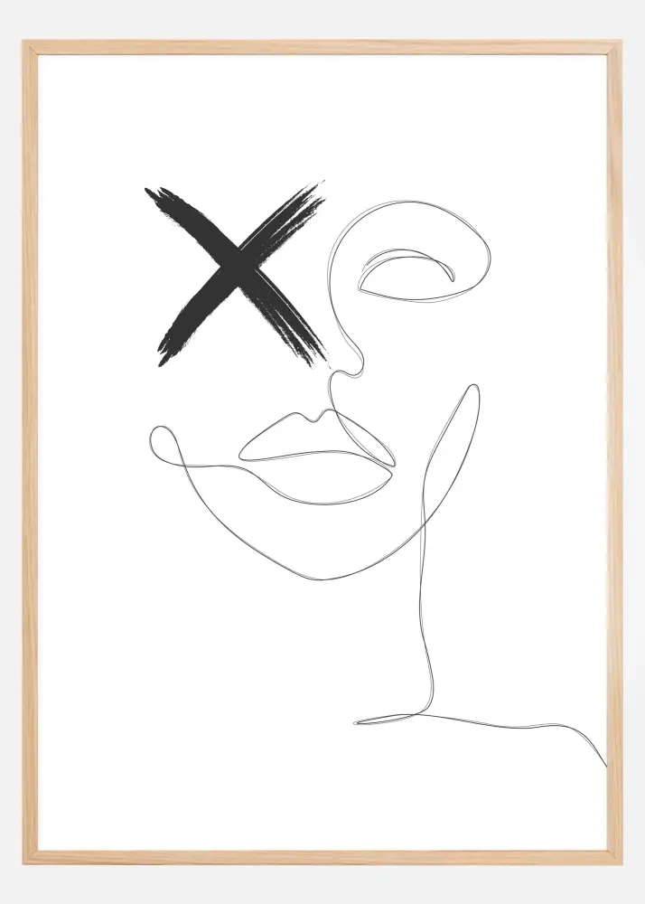 Abstraktus plakatas su veidu, nupieštu plona juoda linija ant balto fono. Linija sujungta sklandžiu judesiu, kad būtų nupieštas veidas. Per vieną akį nupieštas didelis juodas kryžius. Pakabinkite jį ant spalvingos sienos, kad sukurtumėte įdomią pokalbio temą.
