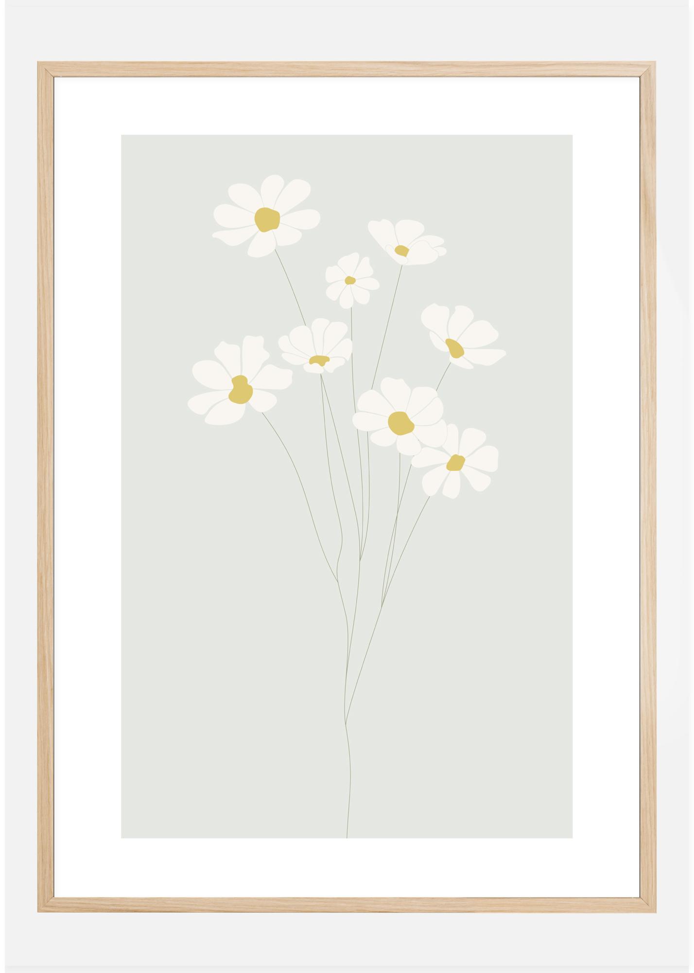 Subtilus plakatas su saulutės atvaizdu, kuris atrodo trapiai. Paprastos baltos ir geltonos gėlės stiebiasi aukštyn ant plonų stiebų prieš švelnią blyškiai mėlyną foną. Pakabinkite šį atvaizdą savo vaiko miegamajame, kad sukurtumėte ramybės, bet mielą atmosferą.