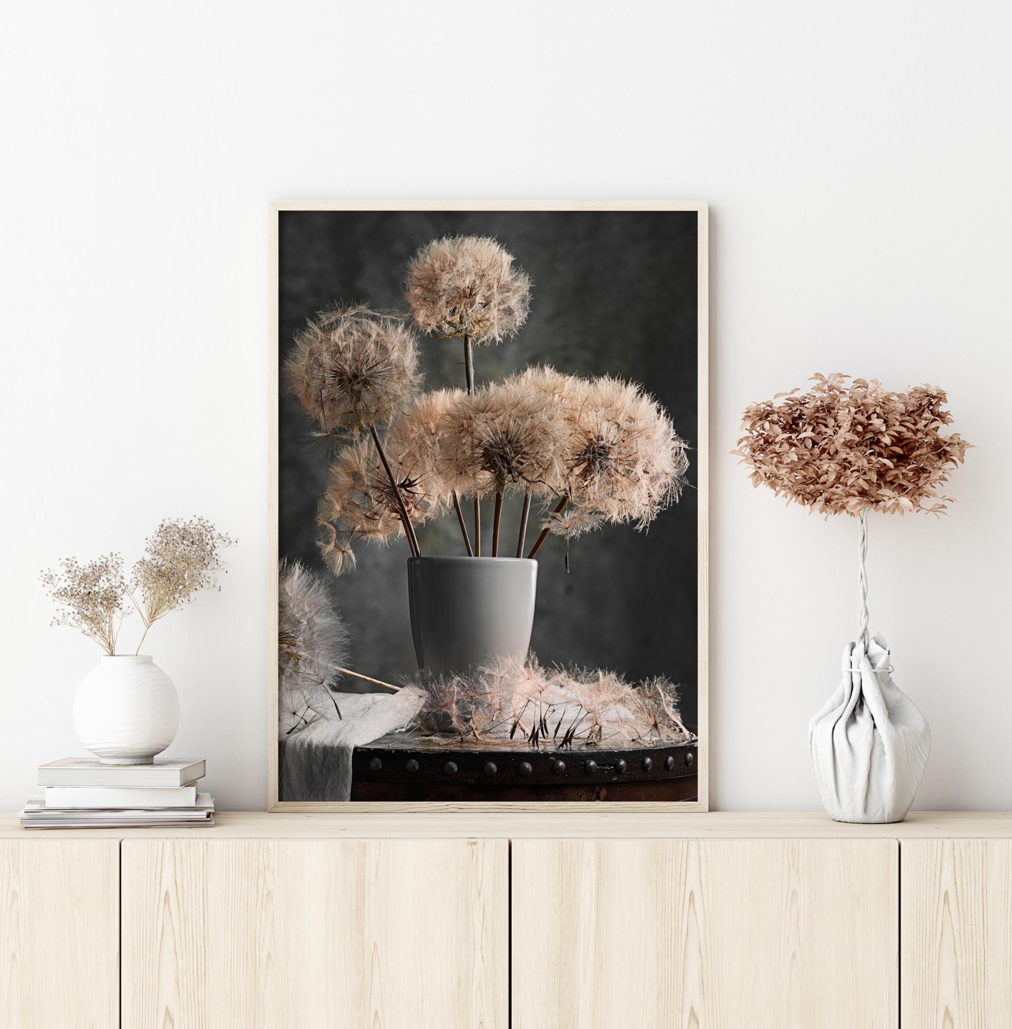 Stilizuotas plakatas su nuvytusių pienių puokšte vazoje prieš tamsiai pilką foną. Pienių pūkai pradėjo byrėti, o jų sėklos sklando aplink gėlių galvutes. Įsivaizduokite laiko tėkmę, žvelgdami į šias nuvytusias pienių puokštes.