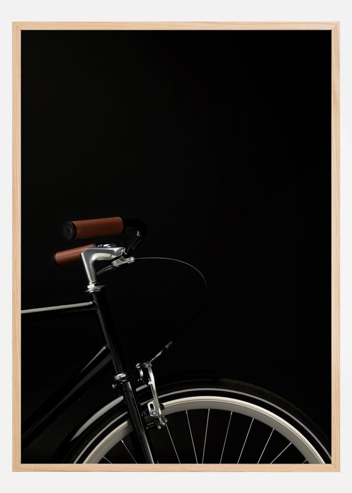 Įspūdingas plakatas su viršutine dviračio puse prieš solidų juodą foną. Rudos vairuoto rankenos, švytinti chromo rėmas ir balta padanga ryškiai išsiskiria iš juodo fono. Dviračių entuziastui šis atvaizdas yra būtinas.