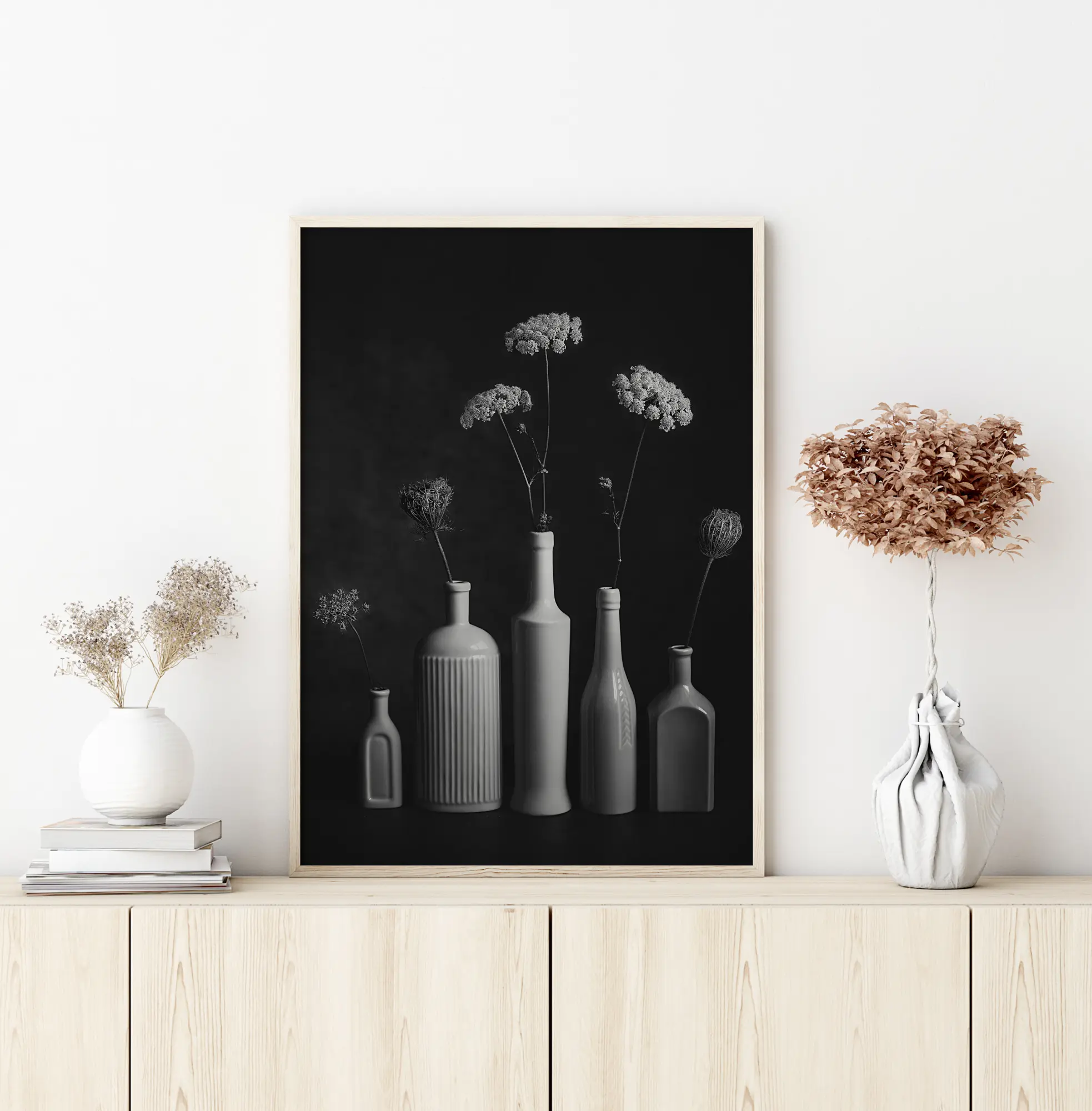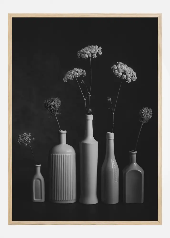 Tradicinis plakatas su buteliais ir gėlėmis paprastame juodame fone. Pridėkite olandiško tapymo stiliaus į savo namus su šia paprasta, bet stipria butelių ir gėlių kompozicija.