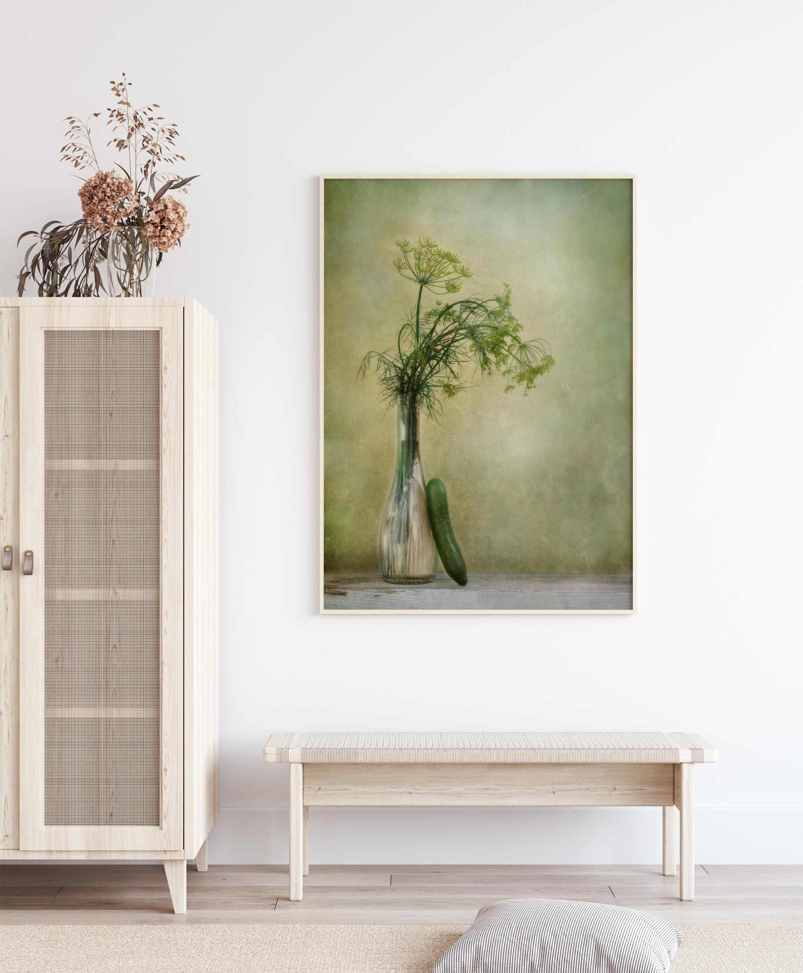 Daržovių plakatas su krapais ir agurku bei švelniai žalia ir geltona siena. Stiklinė vaza laiko krapus, į kuriuos remiasi agurkas šiame natiurmorte. Švelnūs akvareliai fone yra šviesesni aplink lapus, bet tamsesni link kraštų. Pakabinkite šį darbą virtuvėje, kad sukurtumėte saldų, daržovinį pojūtį.