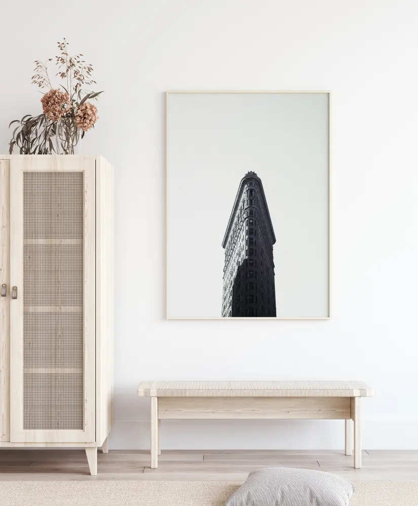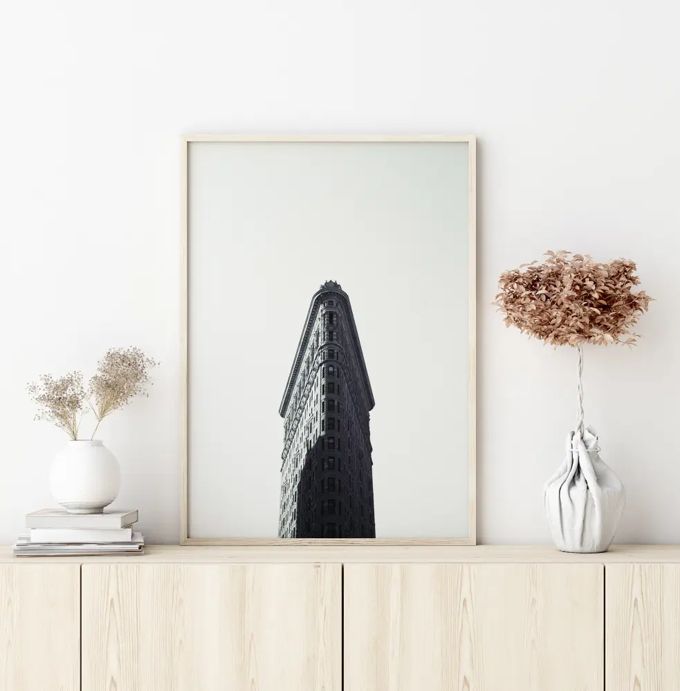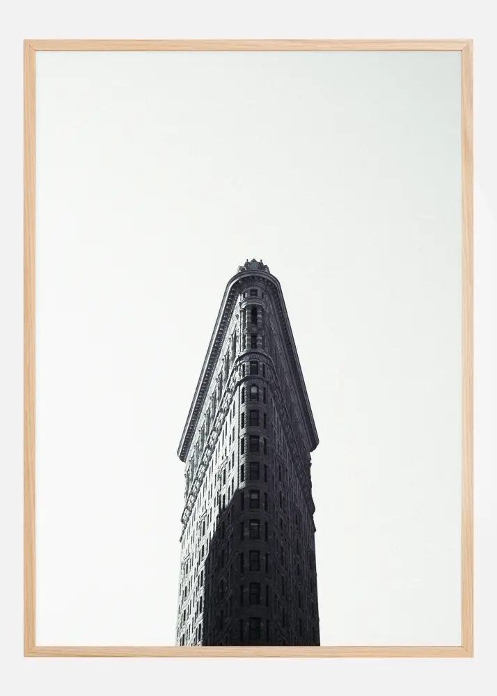 Architektūrinis plakatas, rodantis seno daugiabučio namo priekinį kampą. Pastato priekinė dalis atrodo kaip laivo priekinė dalis, kuri stipriai kontrastuoja su balta dangaus spalva. Trikampė forma pritraukia žvilgsnį ir veda jį aukštyn pastatu. Pakabinkite šį kūrinį ant vienspalvės sienos, kad sukurtumėte meninę atmosferą.