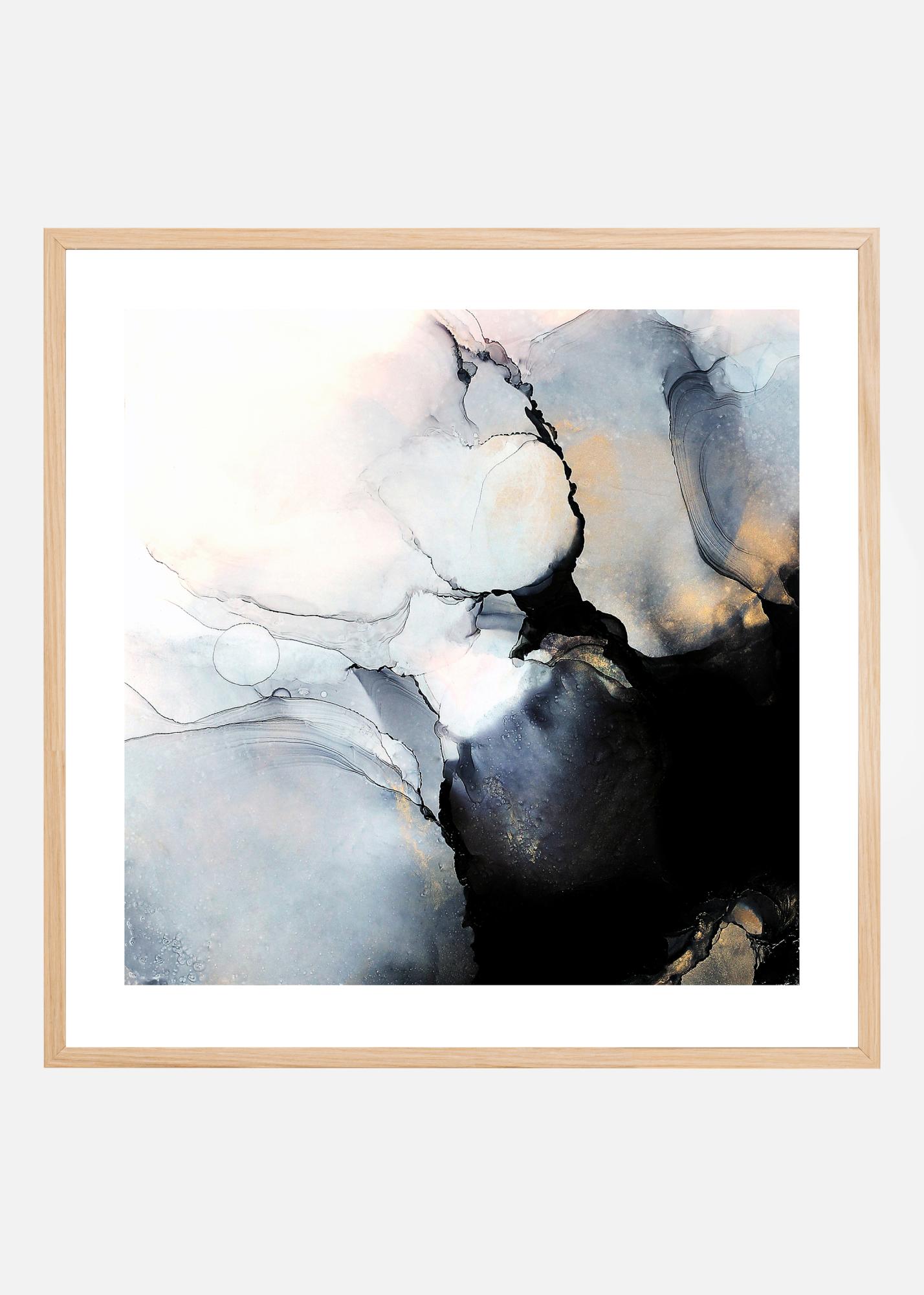 Nuostabus abstraktus meno plakatas akvarele, juodos, mėlynos ir aukso atspalviais su švelniais rožinės spalvos elementais, sukurtas menininkės Gabriella Roberg. Vienas iš plakatų puikiai dera su Gabriellos meno kūriniu DAWN.