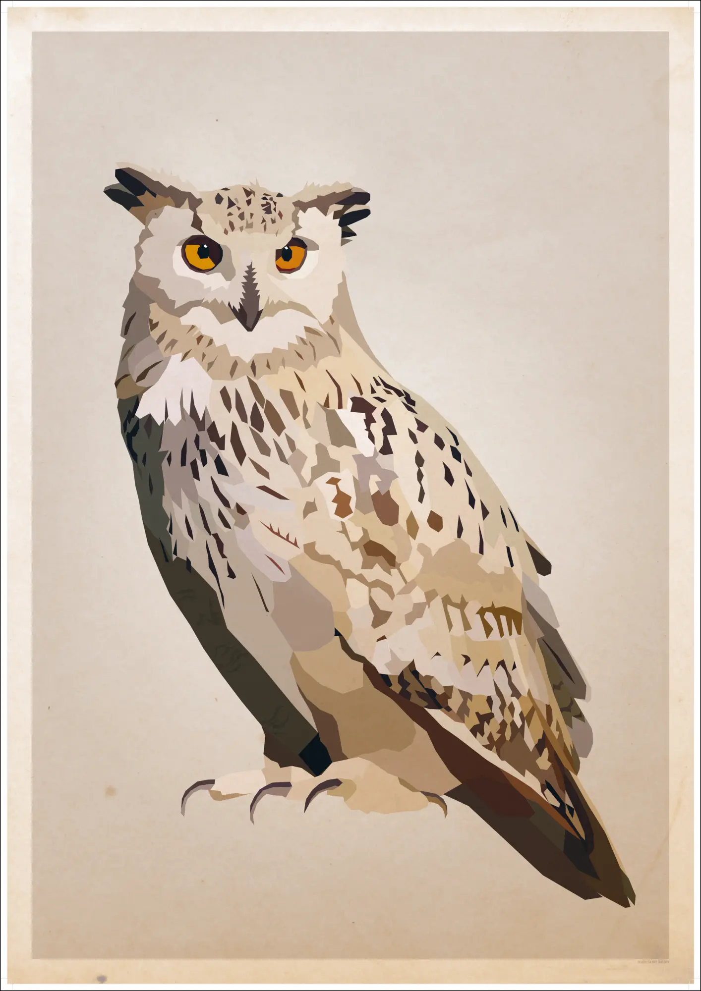 Meniškas plakatas su tapytu euraziniu ūdru. Šepetėlių potėpiai sukuria minkštą plunksnų struktūrą įvairiais rudais ir kreminiais atspalviais. Pelėdos oranžinės akys žvelgia į tave ir įtraukia į šį įtraukiantį vaizdą. Pakabinkite ant neutralios sienos, kad sukurtumėte stilingą interjerą.
