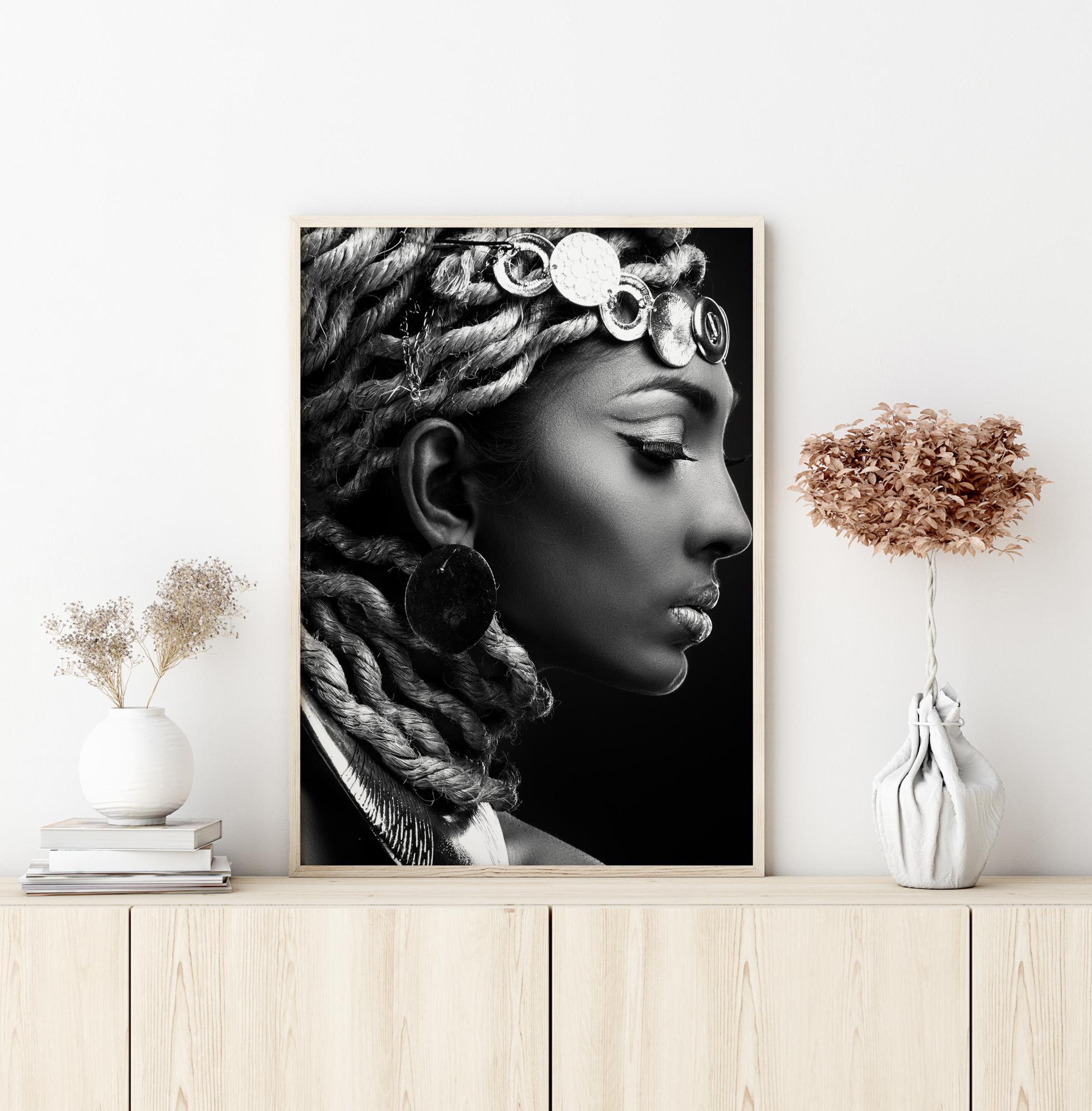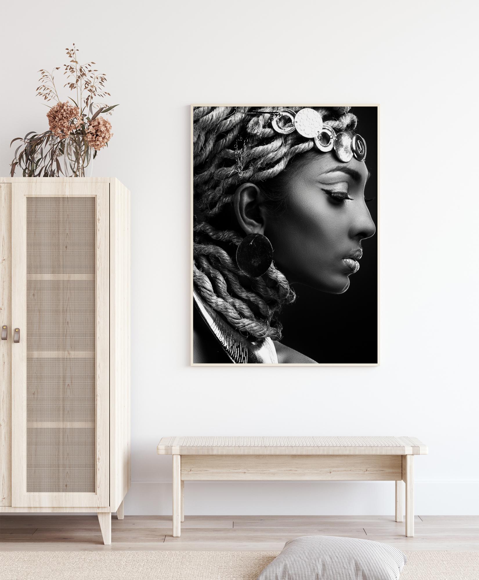 Nuostabus portretinis plakatas su moters profiliu, kur ji apsirengusi senoviniu egiptietišku stiliumi. Šis juodai baltas paveikslas sukuria dramatišką jausmą, nes ši graži moteris arogantiškai žiūri žemyn. Jos galva, ausys ir kaklas yra padengti dideliais auksiniais papuošalais, simbolizuojančiais turtus. Kasdien įkvėpkite šios stiprios moters.
