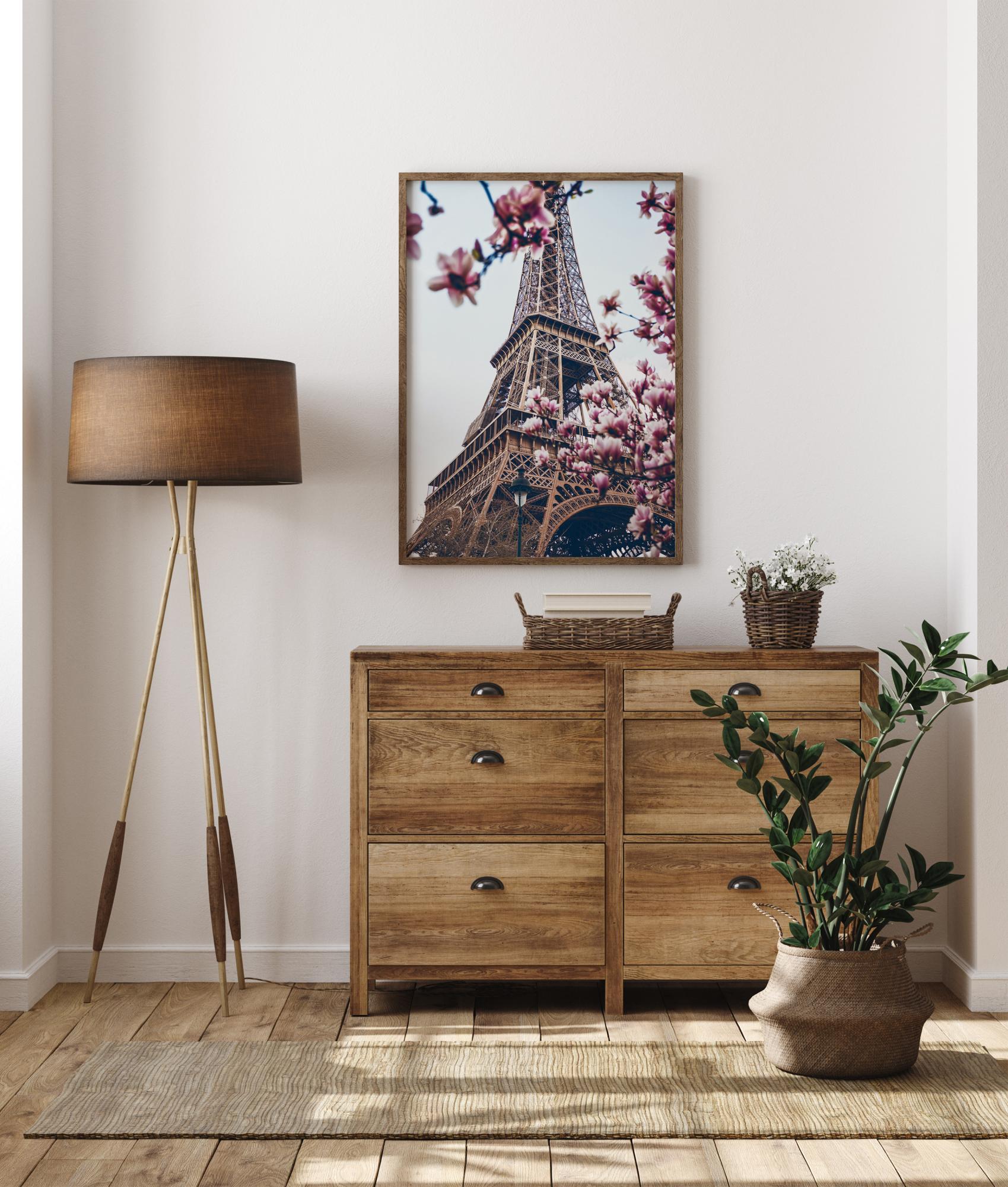 Raminantis meninės fotografijos atvaizdas su Eifelio bokštu, kurio priekyje esančios gražios magnolijos suteikia nuostabų spindesį ir gražų gylį vaizdui. Romantiškas plakatas, kurį lengva derinti su kitais mėgstamais kūriniais.