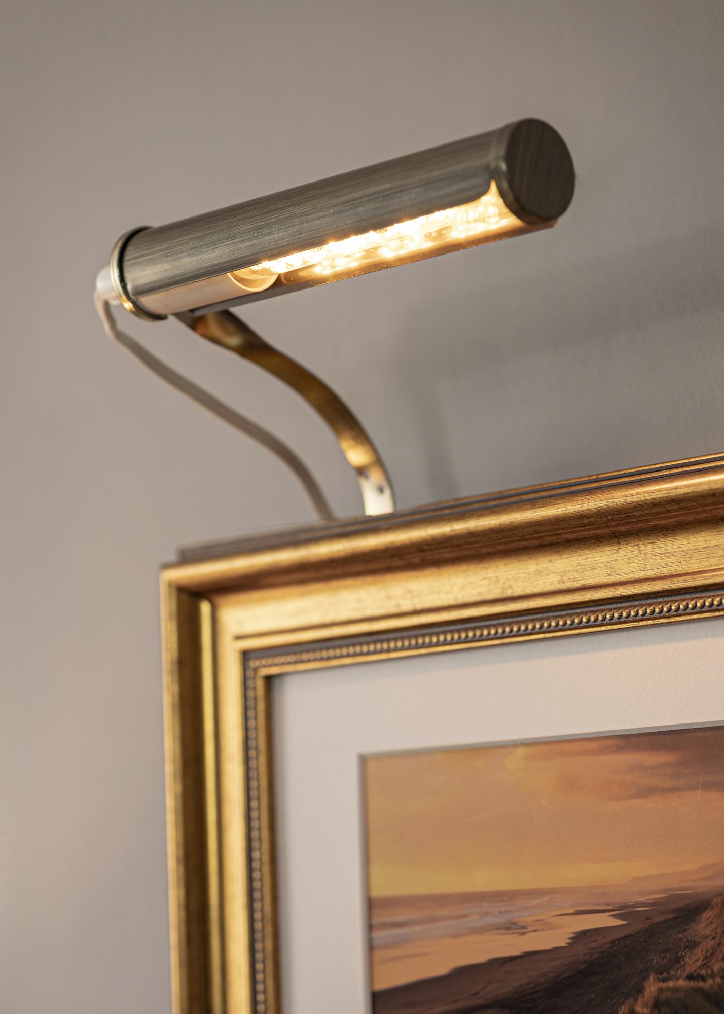 Paprastai paveikslų apšvietimą tvirtinate rėmo gale, trūkumą lemia tai, kad reikalingas medinis rėmas (taip pat tinka kai kurie kompozitiniai rėmai), kuris turi platų profilį, kad būtų galima įsukti į rėmą. Su mūsų sieniniu tvirtinimu jums nereikės apie tai galvoti ir tiesiog pritvirtinsite jūsų paveikslų apšvietimą tiesiai prie sienos už paveikslo.