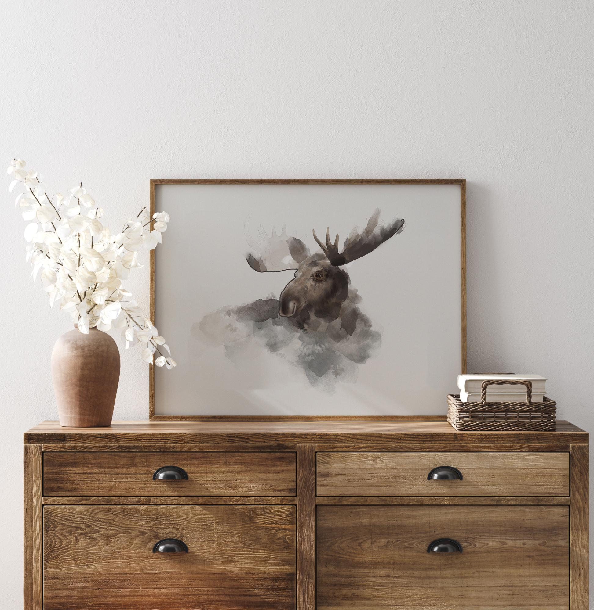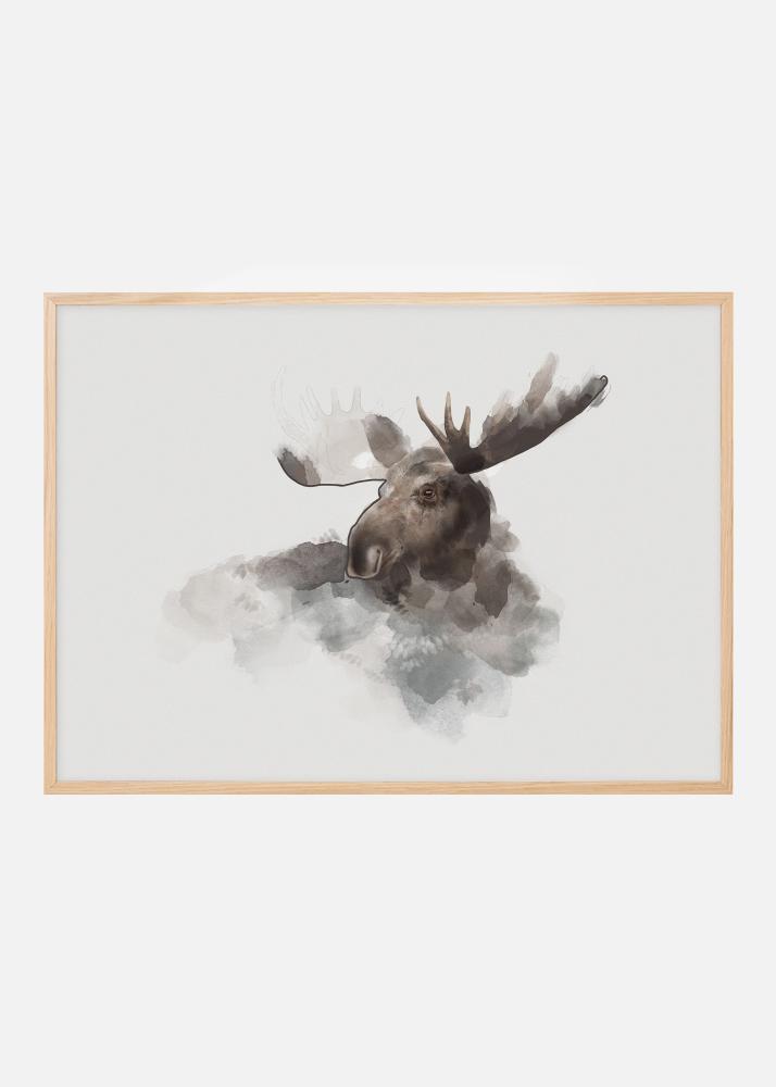Akvarelės plakatas su briedžio galva. Švelnūs teptuko potėpiai palaipsniui formuoja briedžio veidą, jo ragai vis dar nėra visiškai sukurti. Pakabinkite šį debesies formos vaizdą ant neutralios sienos, kad išlaikytumėte švelnų eleganciją savo namuose.