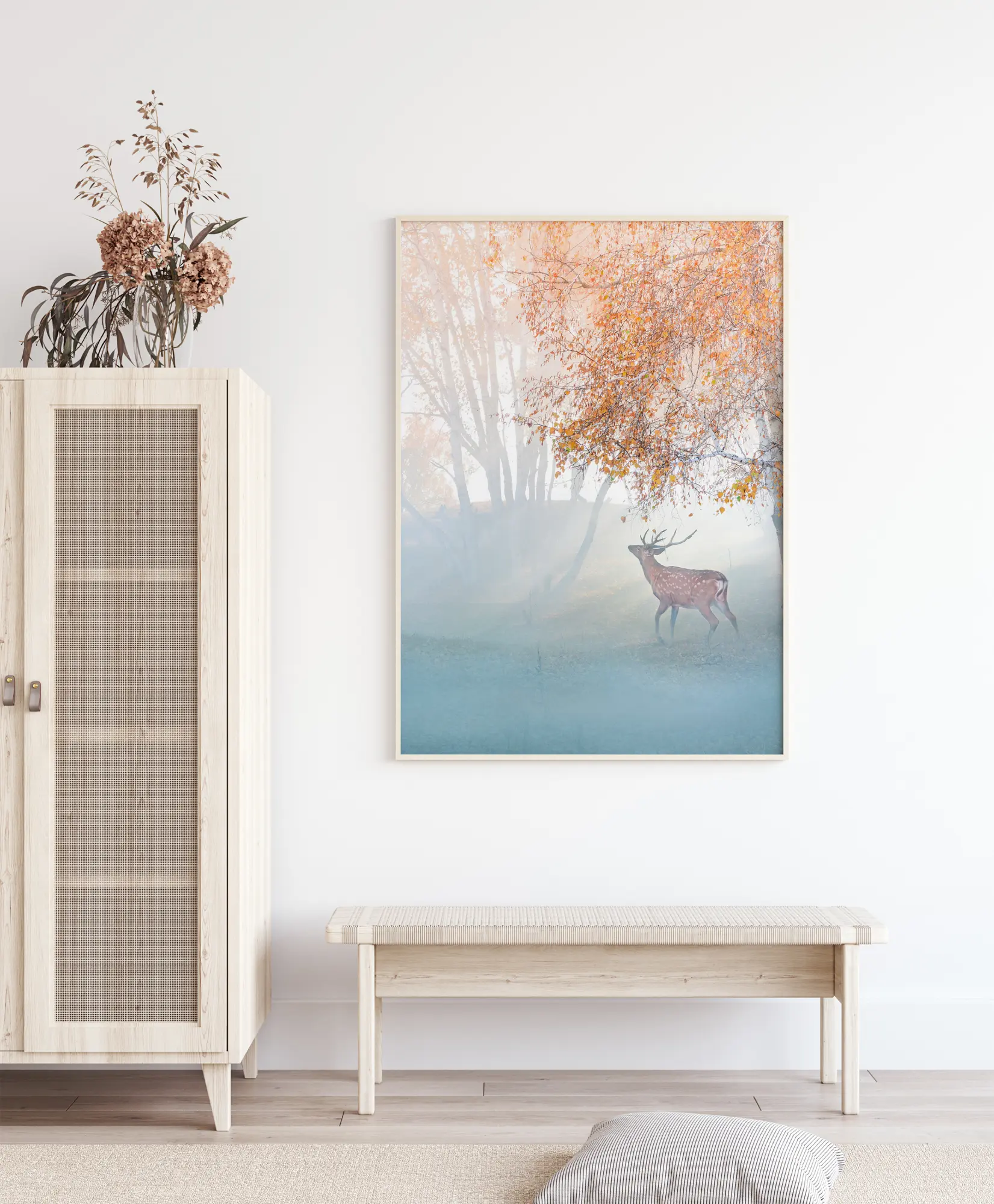 Nuostabus gamtos plakatas su elniu, pasiklydusiu rūke. Šis rūko vaizdas sukuria magijos ir nuostabos jausmą, kai elnias juda per kraštovaizdį. Oranžinės ir mėlynos spalvos mišinys sukuria švelnų, apgaubiantį jausmą su šviesa, švelniai sklindančia per medžius. Pasinerkite į šią magišką žemę.