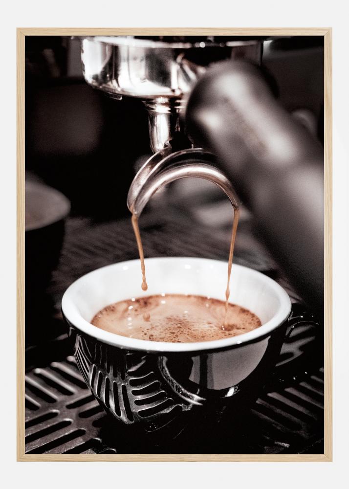 Šis plakatas užfiksuoja beveik jausmingą espresso, pagaminto iki tobulybės, momentą, kai aukso rudos kavos lašai susijungia su porceliano baltumo puodeliu intymiu šokiu. Tai yra odė kavos mėgėjams ir žinovams, vaizdas, perteikiantis tiek turtingą aromatą, tiek stiprų skonį, kurį siūlo espresso. Atrankinis dėmesys į kavos srovę ir puodelį apačioje, priešais neaiškią espressomatinės fone esančią aplinką, sukuria efektą, kuris leidžia žiūrovui beveik jausti šilumą ir girdėti garų ošimą.