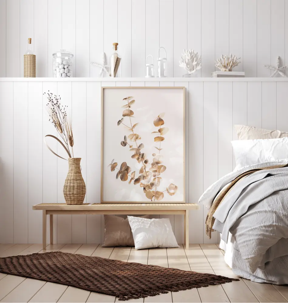 Žavus plakatas su auksinėmis eukalipto šakelėmis. Aukso spalvos ir rudi lapai yra švelnūs, kur jie išsikiša iš balto fono. Lapai yra apvalūs, kas sukuria gražias formas paveiksle. Šis plakatas suteikia ramią ir stilingą atmosferą jūsų namams.